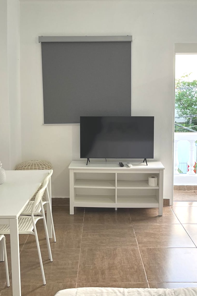 This beautifully designed home near Parque Central Santiago offers two air-conditioned bedrooms, two modern bathrooms, and a fully equipped kitchen with stainless steel appliances, marble countertops, and gold fixtures. The open-concept living area features stylish decor, a flat-screen TV, and natural light. The master bedroom stands out with bold blue velvet curtains and a plush tufted bed. Perfect for comfort and style, this property blends modern living with a prime location.
