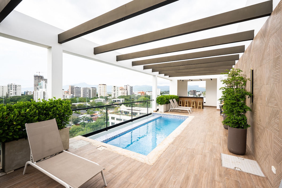 Disfruta de una estadía exclusiva en este moderno apartamento en Torre View, con impresionantes vistas de Santiago. Totalmente equipado, ofrece una cómoda sala de estar, cocina moderna y dormitorio acogedor. Ubicado en una zona privilegiada, con seguridad 24/7 y acceso a amenidades de lujo. Ideal para viajes de negocios o placer. ¡Vive la experiencia con estilo y confort!