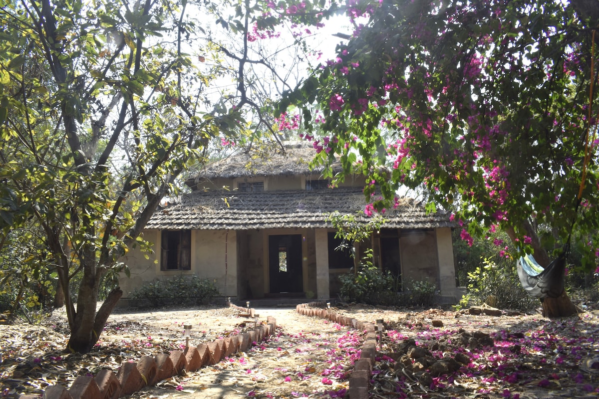 Beautiful two-storeyed artisan villa nestled in the midst of an orchard & kitchen garden lush with flowers where we grow fruits and vegetables year-round. Surround yourself in lush greenery and abundant flowers in a house meticulously designed by artists with all their love. Enjoy the rich cultural heritage of Shantiniketan, Bolpur with Sonajhuri Forest, Kopai River & Visva Bharati University (closed wednesday)all within 10 mins distance. The nearest railway station is Prantik, also 10 mins.