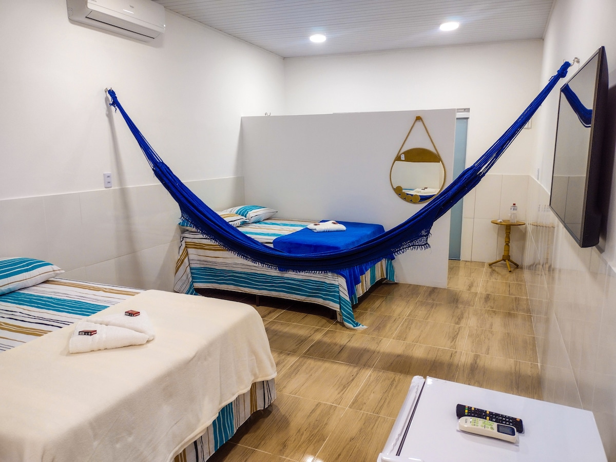 Nosso espaço dispõe de 2 camas de casal, espaço para 2 redes, smartv 50", frigobar, ar condicionado e banheiro privativo. É um espaço único e totalmente independente, pensado e projetado para viajantes que desejam uma hospedagem de baixo custo para descanso entre os passeios nos lençóis maranhenses. Sua entrada é de fácil acesso com uma porta de vidro adesivada com a foto dos lençóis maranhenses. Localizado a 100 metros da praça central, é próximo a panificadoras, restaurantes e lanchonetes.
