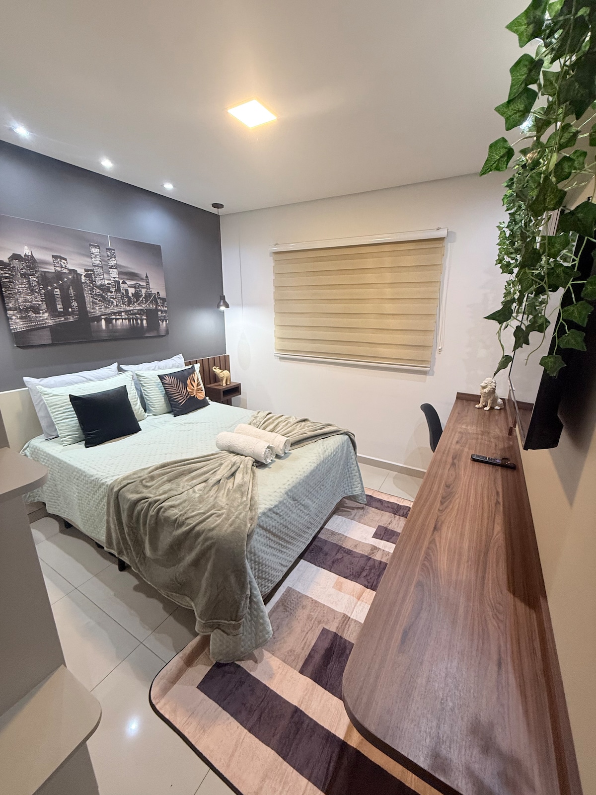 Curta uma experiência elegante neste lugar bem-localizado,com fácil acesso para restaurantes,mercados,transporte público, táxi, todos os eletrodomésticos são de muita qualidade com cafeteira nespresso,máquina lavar roupas e secar,forno micro-ondas com forno elétrico, Wi-Fi de 500 megas,tv com vários canais pagos,roupas de cama,toalhas ,enredo,academia completa, salão de festas com churrasqueira.