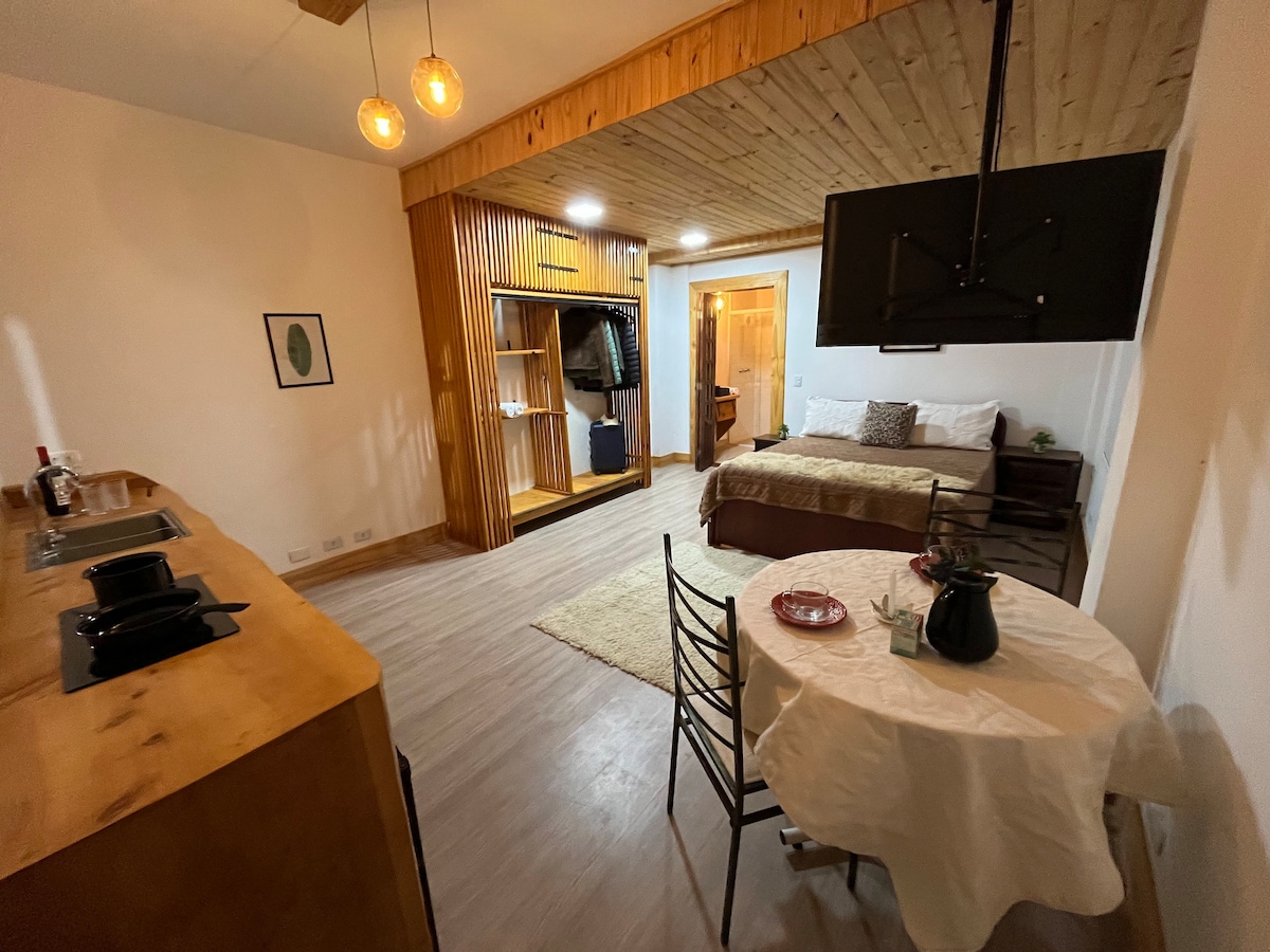 Uma suíte que te abraça, perfeita para você descansar e ter uma estadia maravilhosa com seu parceiro (a)!! Com uma linda vista para as montanhas pela janela, a suíte possui cama box casal, tv smart 32¨, frigobar, microondas, mesa para refeições rápidas e cafeteira. Aqui você também terá Netflix de cortesia e 1 vaga de estacionamento (descoberto).