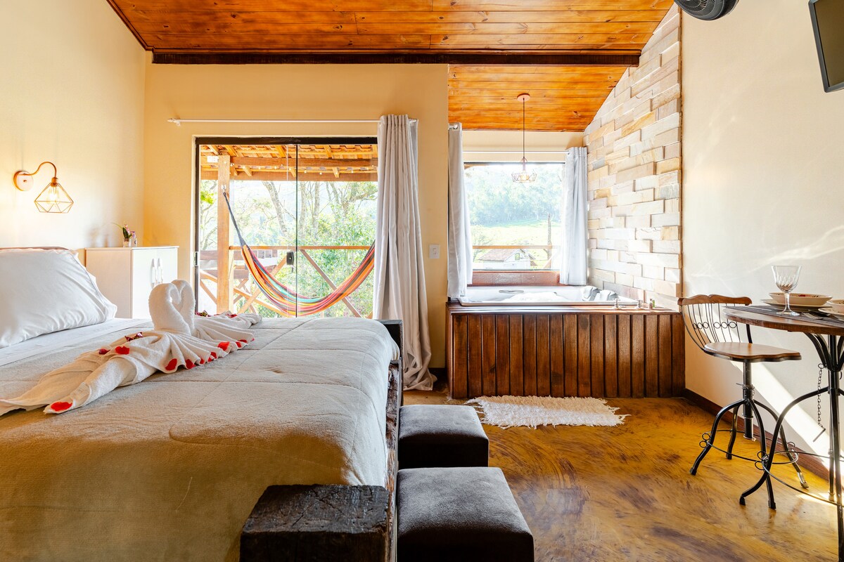 Chalé rural em plena serra da Mantiqueira. Ideal para os que buscam conforto, privacidade e tranquilidade em meio a natureza. Espaço para 2 pessoas com banheira de imersão e vista para as montanhas em meio a floresta particular. Deck com vista panorâmica. Situado no coração da serra a 16km do centro de Santo Antônio do Pinhal (SP), 10km de Sapucaí Mirim (MG) e 18km de São Bento do Sapucaí (SP), cidades que dispõe de excelentes opções gastronômicas, entretenimento e turismo de aventura.