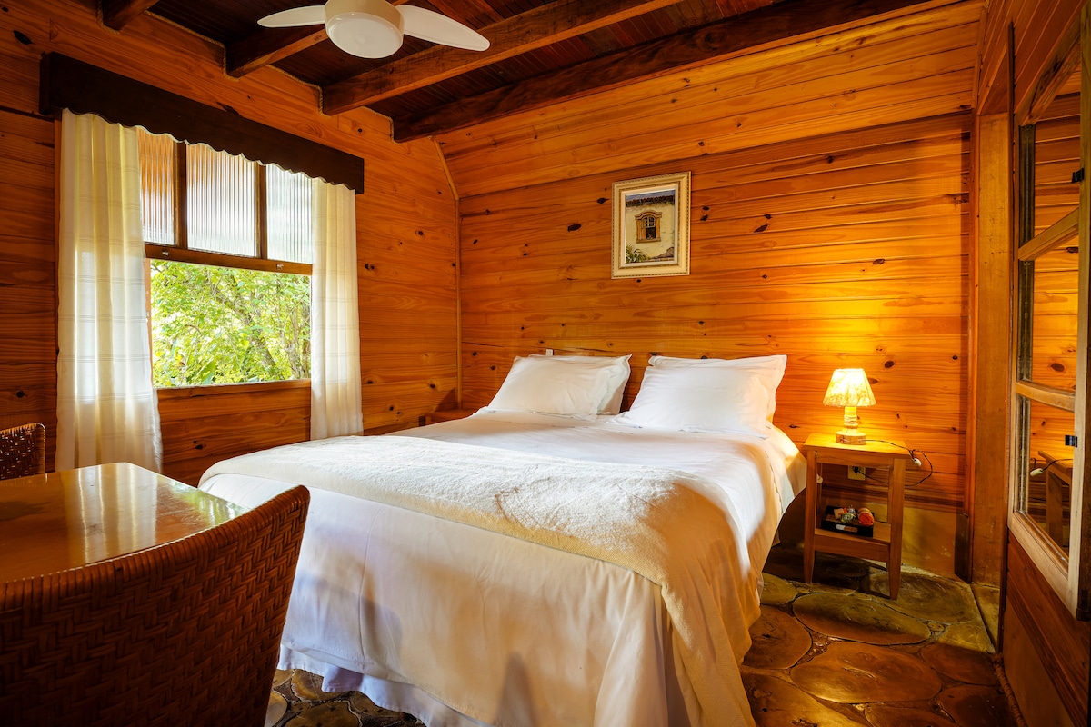 O café da manhã não está incluso na diária, mas possui um restaurante dentro da propriedade para quem quiser comprar. Esta Cabana tem uma suíte com cama Queen, banheiro privativo a gás, e um mezanino com cama de casal Queen. Além disso tem uma Hidromassagem e Sauna. No térreo tem uma sala com lareira, TV e a cozinha com microondas, fogão elétrico 02 bocas, frigobar, além de uma vista linda. Essa cabana tem dois andares com escada de acesso. O estacionamento do carro fica na porta da Cabana.