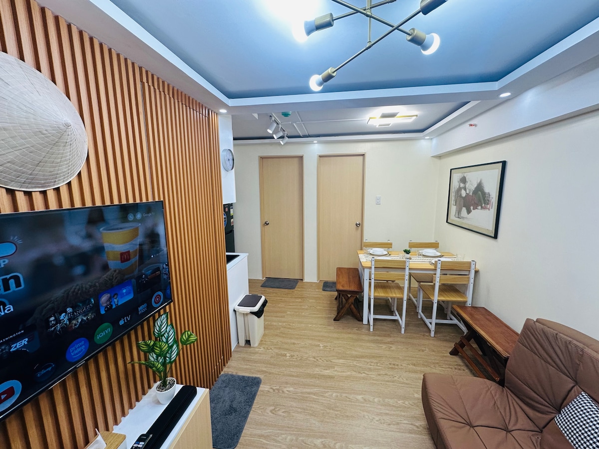 a big Air-conditioned 62sqm corner unit, stragically located at a main road with balcony opening at the pool. the place is few steps from SM Hypermarket for all of your needs and groceries as well as you will have a Well equipped Kitchen you can park directly under your place with A free parking at the basement Enjoy unli access to the pool and the gym the shower is with hot water, the Internet is 200 Mbps, you can all of your shows at 4k in the big smart TV