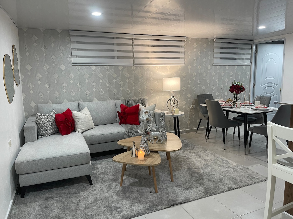 "Moderno apartamento en condominio de lujo, en una zona muy segura. El apartamento tiene cama, nevera, estufa, tostadora, cafetera eléctrica, lavadora secadora, utensilios para cocinar, dos (2) aires acondicionado en sala y habitación. Un parqueo techado y dos televisores con los servicios de Youtube y Nexflix" El Condominio, tiene puerta eléctrica, una impresionante área social, gimnasio y salón de reuniones