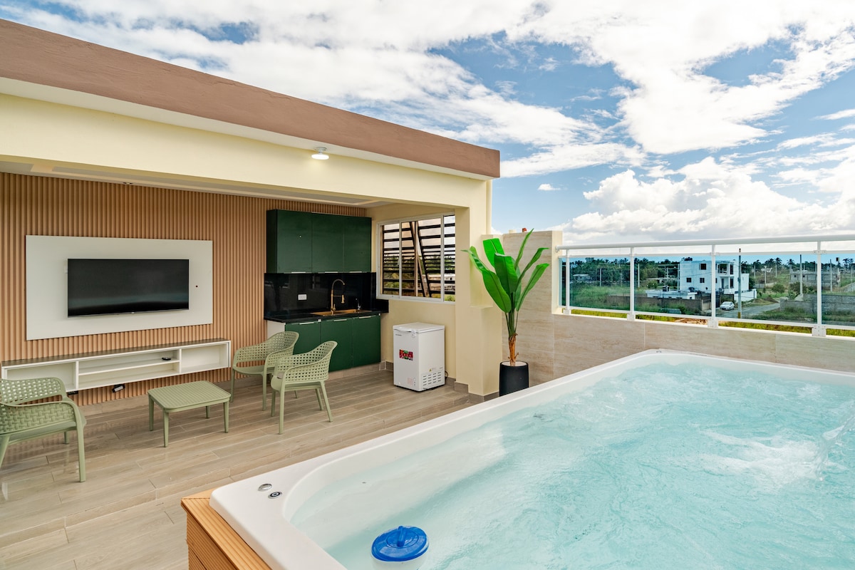Your luxury oasis 13 minutes from the Colonial Zone! ✨ Relax in your private Jacuzzi or enjoy a BBQ on the exclusive terrace. Designed for rest and productivity: • 🛏 Premium King Bed. • ❄️ Total A/C and fast Wi-Fi (ideal Home Office). • 🍳 Full kitchen and Smart TV. • 🚗 Private and secure parking. Strategic location: close to supermarkets and restaurants. Perfect for digital nomads, couples or long stays. Book your experience today! 🥂