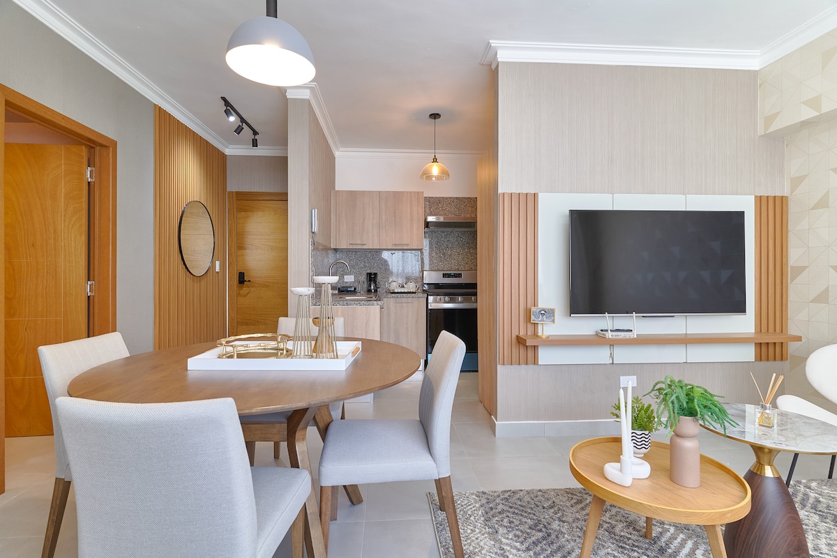 BRAND NEW- 1 Bedroom apartment: - 2 smart TV’s -2 new AC units -New washer & dryer - Safe - High speed internet - Smart front lock - LED lights - electric wine opener -blow dryer - Steamer - 1 parking space (under roof) Kitchen fully equipped (incl an air fryer) Rooftop Terrace: - PICUZZI + GYM with an amazing view. Location: - Downtown of SD. Safe neighborhood, and minutes from El malecón & Zona Colonial. Ask about the romantic set up with champagne or wine bottles and chocolate