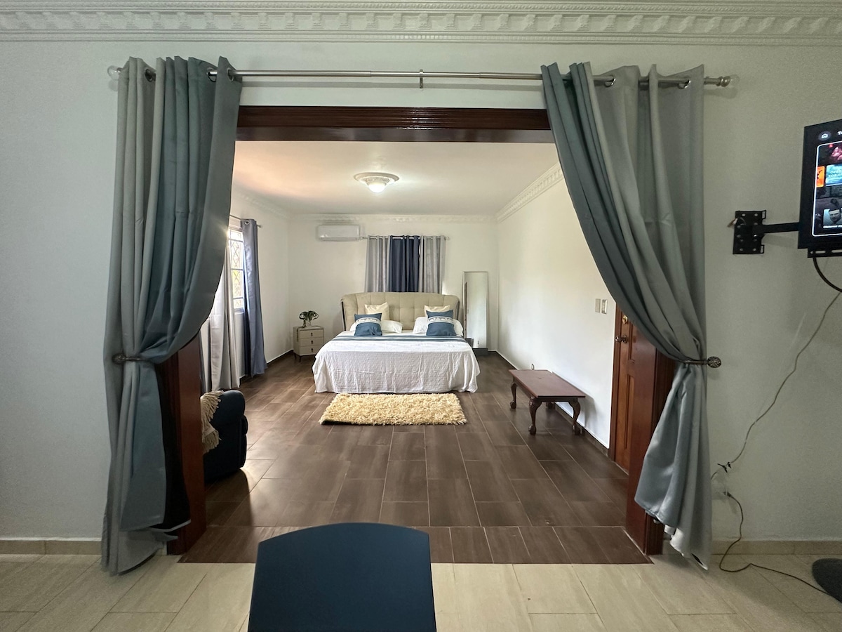 El loft de diseño moderno ubicado en el segundo piso de una casa de diseñador Francés con entrada independiente y terraza privada a minutos del parque Mirador Sur en una zona céntrica, residencial y tranquila de Santo Domingo. Con una fusión armoniosa entre lo urbano y lo natural. Grandes ventanales que permiten que la luz natural bañe el espacio, resaltando tonos tierra y verdes vibrantes. El loft con su propia terraza es un escape encantador en el corazón de la ciudad.