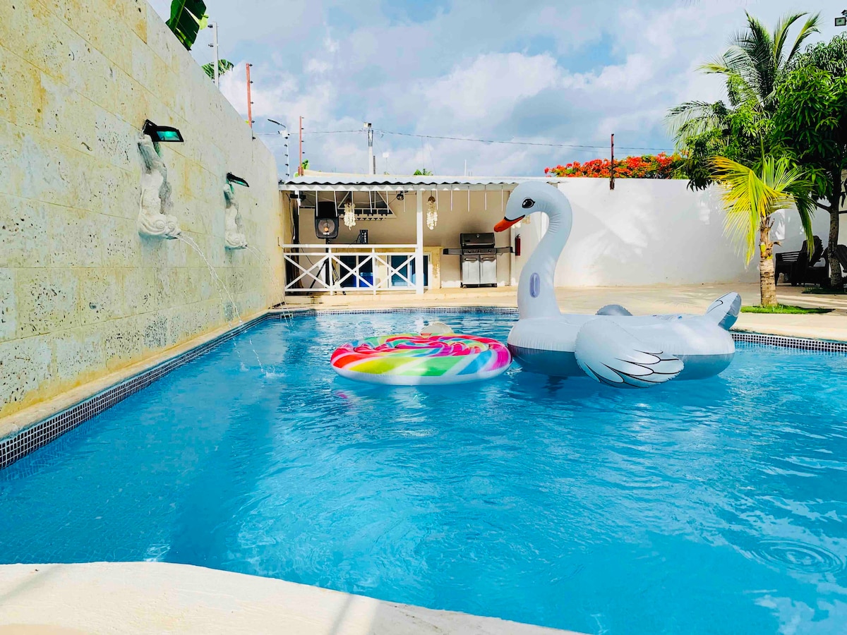 Quieres desconectar y disfrutar de la naturaleza? Este alojamiento es ideal para pasar un fin de semana con toda la familia, con una decoración moderna y acogedora que te permitira sentirte como en casa. Disfruta de uno de los mejores espacios al aire libre en la piscina, donde puedes prepararte una deliciosa barbacoa mientras te relajas y disfrutas del sol . A 15 minutos del aeropuerto de las Americas y a 12 minutos del centro de la ciudad.