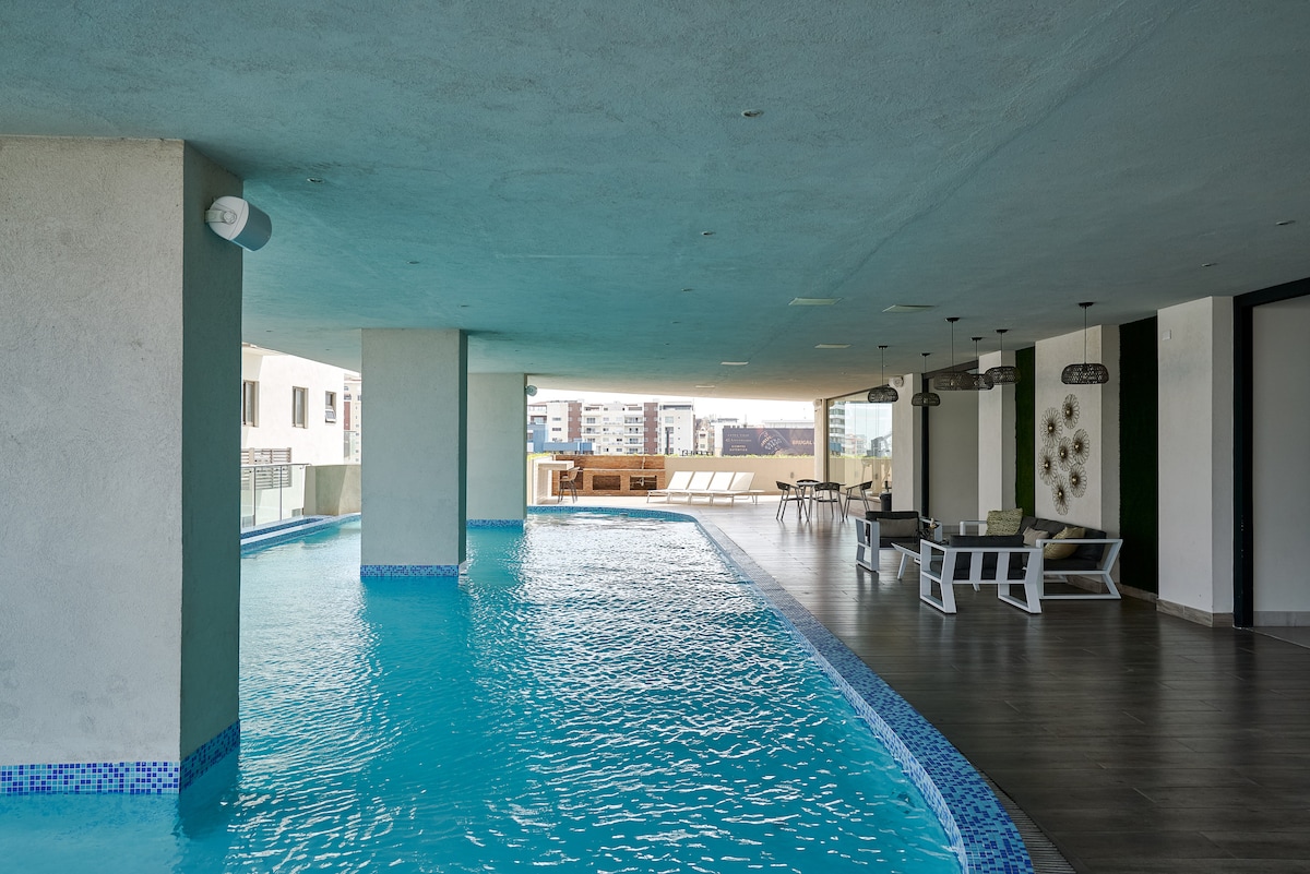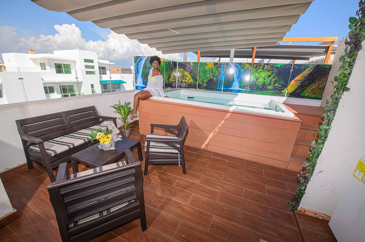 Come and decompress into your private oasis retreat. This penthouse features 4 bedroom, 3 bath, fully equipped kitchen, and calming jacuzzi. Immerse yourself in panoramic views from rooftop terrace. We are located in one of the best residential area in Santo Domingo Este. Just 15 min. from Las America International Airport, and 20 min. from beaches. Nearby you will also find great restaurants, bars, supermarket, shopping centers and pharmacies. Book now for the utmost Dominican Experience!!
