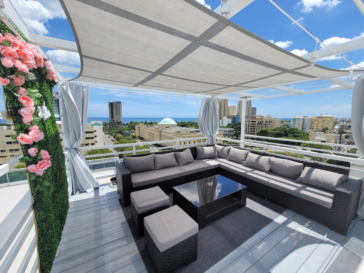Ideal for groups, Perfectly located in prestigious Gascue next to Palacio Bellas Artes, close to everything. Large 2 floor Penthouse (both floors elevator access). 4 Bedrooms with AC/4.5 Baths, Ocean/City views, 2 floors, 2 rooftop terraces, 2 parking spaces. Walk to El Malecon, Restaurants, Banks, Market and a short 8 minute drive to Zona Colonial, City Center, Plastic Surgery Clinics and attractions. Dedicated work space with internet, 4 smart TVs and much more. Smart lock for easy check-in.