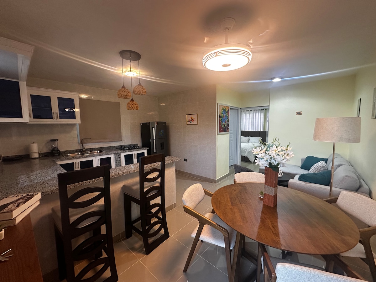 Este alojamiento con estilo único lujoso confortable seguro minimalista a 30minutos del malecón y 1:20 playa bocachica , buenos centro nocturno 5minutos supermercados 7minutos y centros comerciales, energía eléctrica 24/7 y agua permanente.