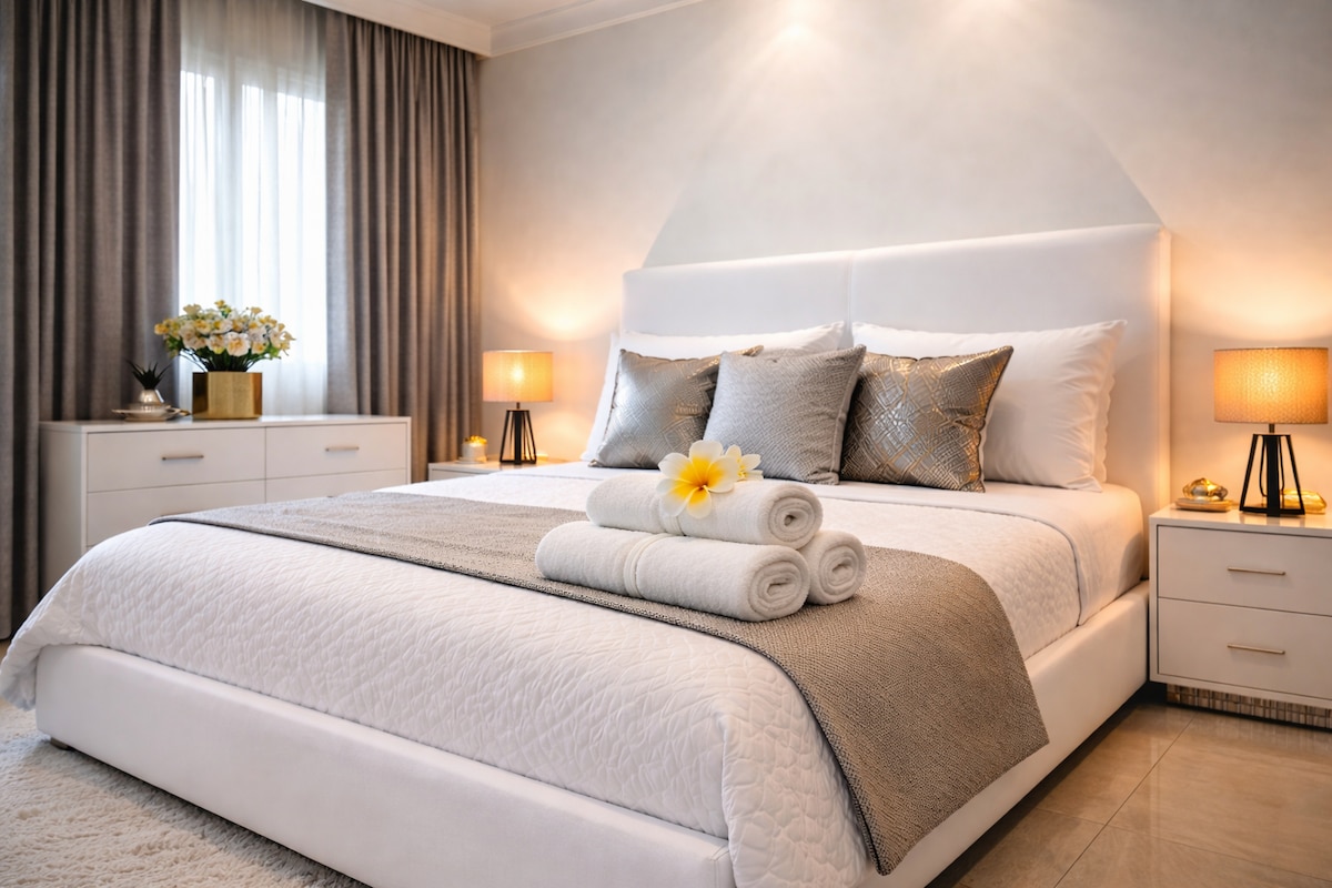 City chic meets family-friendly bliss in this apartment oasis. Sunlit rooms, a gleaming pool, and top-notch amenities set the stage for modern luxury. The rooftop vista is breathtaking, and a dedicated child-friendly area ensures a perfect balance of sophistication and family comfort. Suite (Iconic tower) Premium bedding, down comforters, pillows .Make some memories at this unique place.