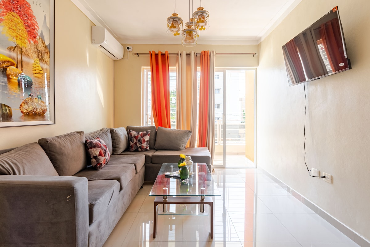 Modern apartment in a luxury high-rise on the 14th floor, centrally located in Santo Domingo. Features 1 bedroom, bathroom, living room, full kitchen, laundry area, balcony, and 2 covered parking spaces. Sleeps up to 4. Building amenities: pool, gym, social terrace, kids’ area, jogging track, BBQ, sauna, and spa. 24/7 security. Perfect for families or business trips.