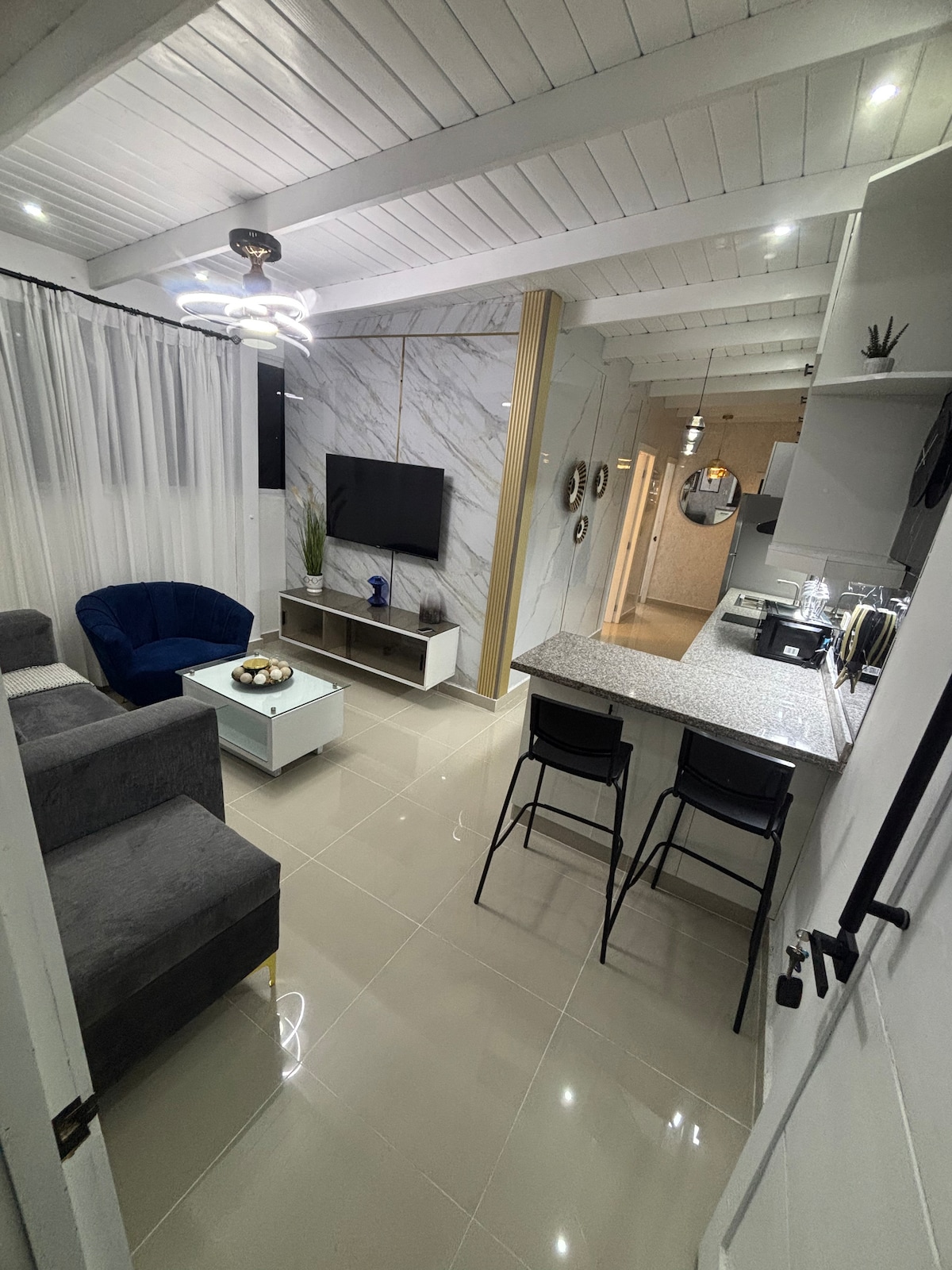 Apartamento con agua🌡caliente 🚿en control de acceso cerrado, seguridad privada ✅️ confortable con TV 🖥 de 65 pulgadas en la sala, configurada con el XBOX 🕹 series S (Juegos disponibles como; GTA / Need for Speed) 🕹 En la habitación tenemos TV 📺 de 60 pulgadas con entretenimiento digital disponible; Netflix, YouTube, etc. Aire acondicionado ❄️ de 18K btu, WIFI 📡 disponible de 40 Mbps, nevera Samsung y lavadora automática, secadora incluida. 🧼 Estufa disponible con gas común y extractor.