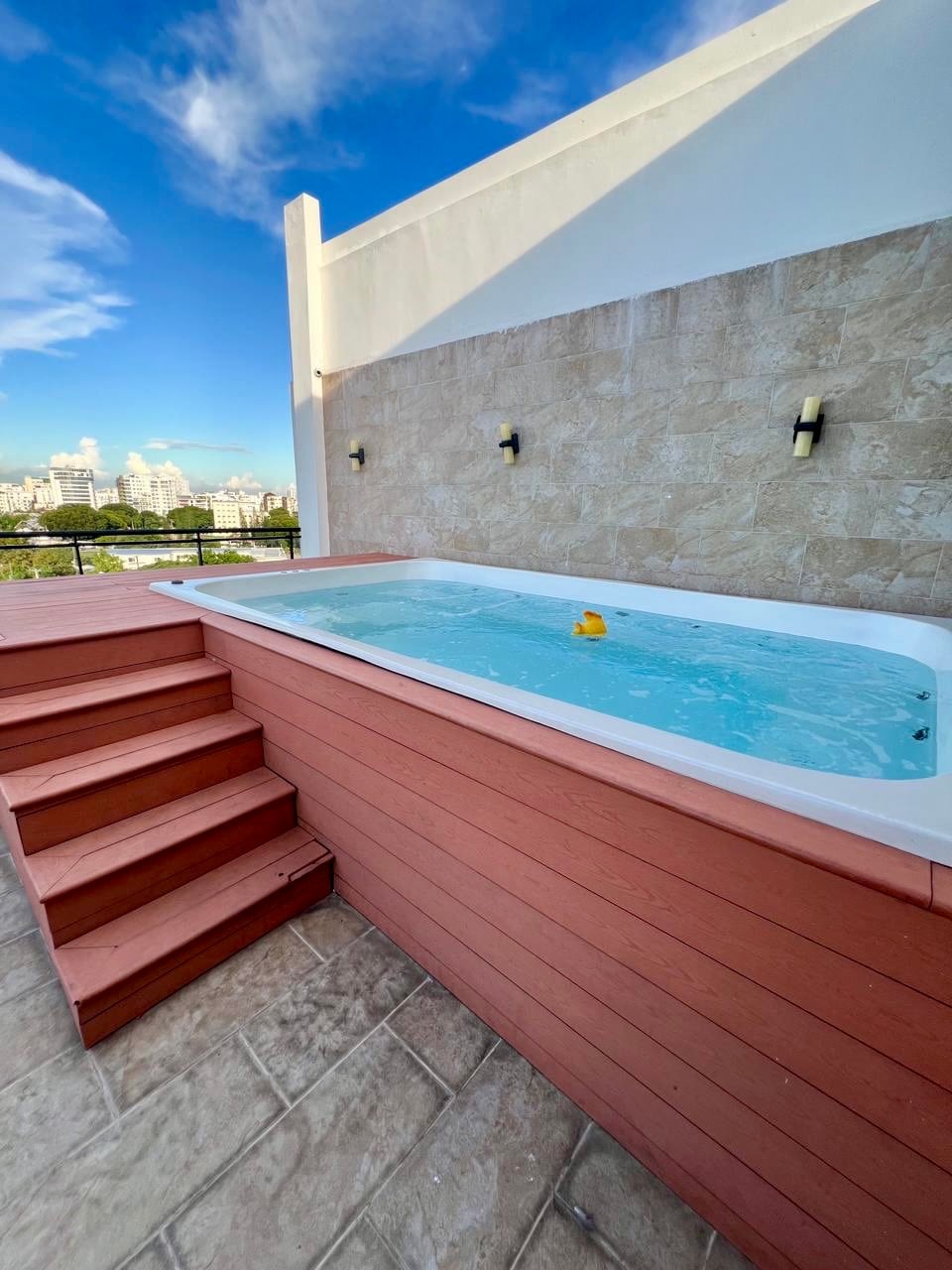 ojo: -Tenemos cerveza disponible para la venta en el refrigerador. -Los parqueos son frente a la propiedad subiendo el carro encima de la acera. Es un residencial cerrado. Apartamento completo Baños Sala-comedor Cocina TERRAZA CON JACUZZI PRIVADO. Bien ubicado cerca de centro comerciales como: Plaza Duarte-Carrefour, Pricesmart, Supermercado Bravo , Plaza Lama. *El jacuzzi se apaga de manera automatica a las 3 horas *Bbq: tiene costos adicionales.