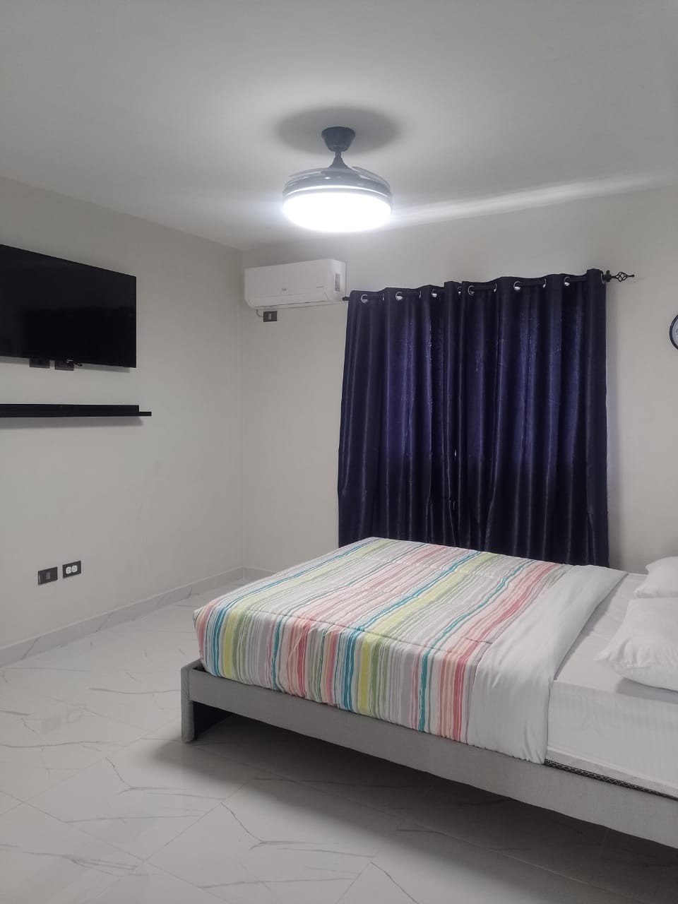 Modern apartment in a luxury high-rise on the 14th floor, centrally located in Santo Domingo. Features 1 bedroom, bathroom, living room, full kitchen, laundry area, balcony, and 2 covered parking spaces. Sleeps up to 4. Building amenities: pool, gym, social terrace, kids’ area, jogging track, BBQ, sauna, and spa. 24/7 security. Perfect for families or business trips.