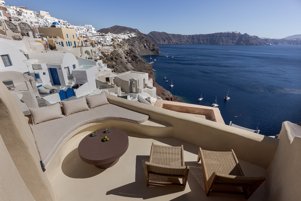 The old bakery of the village awaits just two minutes from Oia's central square, with a private entrance right on top of the stairs that lead to Armeni bay. Carved in the mountain with respect to the unique local architecture and in harmony with the sun-filled, wild volcanic beauty, the newly restored cave house recounts stories of tradition, heritage and style. The red pumice stones, antique marble floors and handcrafted wooden furniture, create the feeling of an authentic warm hospitality.