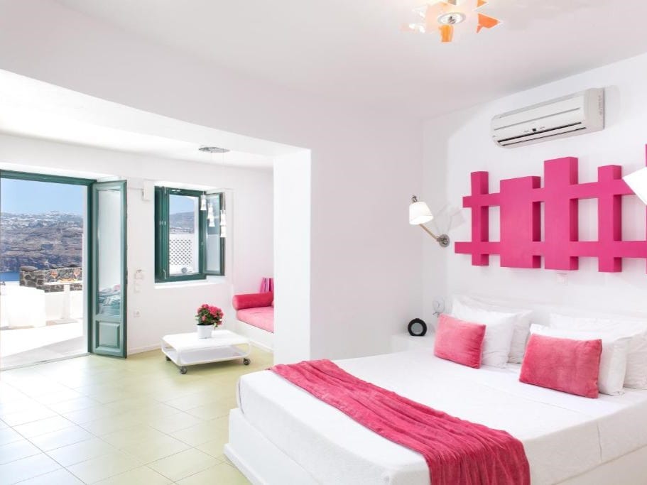 This room features a balcony with panoramic views of the Caldera and the Aegean Sea. It also includes: - balcony with hot tub and sunbeds - free WiFi - air conditioning - flat screen TV with DVD player - safe - mini bar - bathroom with shower, bathrobes and slippers. This room can accommodate 3 adults or 2 adults and 1 child over 2 years old.
