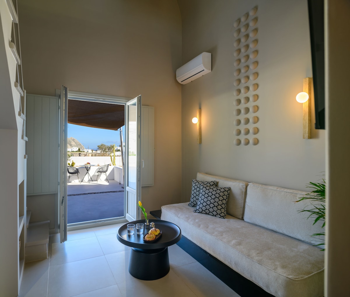 This elegant suite is perched on the cliffs of the caldera in Oia. It combines traditional Cycladic architecture with a minimal decorative style, making it the perfect choice for those who want to relax. The suite is aprox 37 sm, features a private outdoor cave hot tub, offering privacy along with stunning views of the caldera and volcano. Breakfast is included in the price. The room is equipped with air conditioning, free Wi-Fi, coffee and tea-making facilities, bath amenities, and a smart TV.