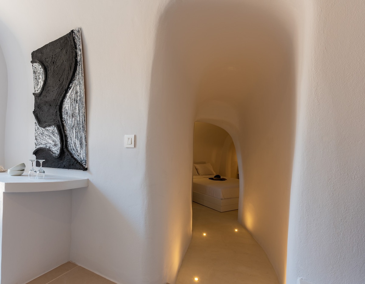 The old bakery of the village awaits just two minutes from Oia's central square, with a private entrance right on top of the stairs that lead to Armeni bay. Carved in the mountain with respect to the unique local architecture and in harmony with the sun-filled, wild volcanic beauty, the newly restored cave house recounts stories of tradition, heritage and style. The red pumice stones, antique marble floors and handcrafted wooden furniture, create the feeling of an authentic warm hospitality.