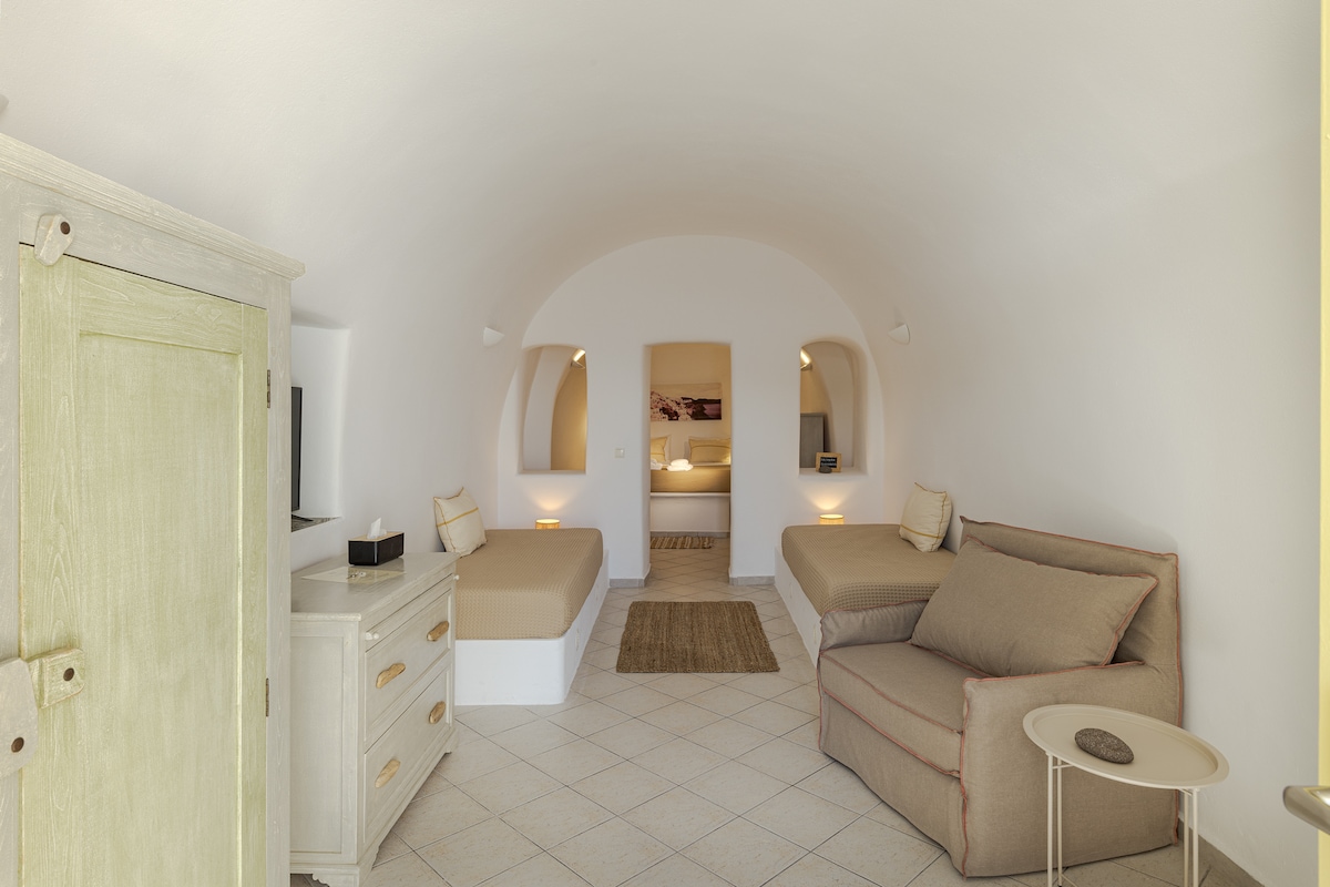 Discover the charm of Earth Cave House, a peaceful hideaway in a traditional area of Oia, perfectly facing the island’s famous sunset. This charming home accommodates up to 5 guests, featuring comfortable bedrooms with queen-size beds, a kitchenette, and cozy living areas. The outdoor space includes a private terrace with comfortable seating spots, sunbeds with umbrella, dining and coffee tables, offering breathtaking views of the Aegean Sea and the caldera cliffs.