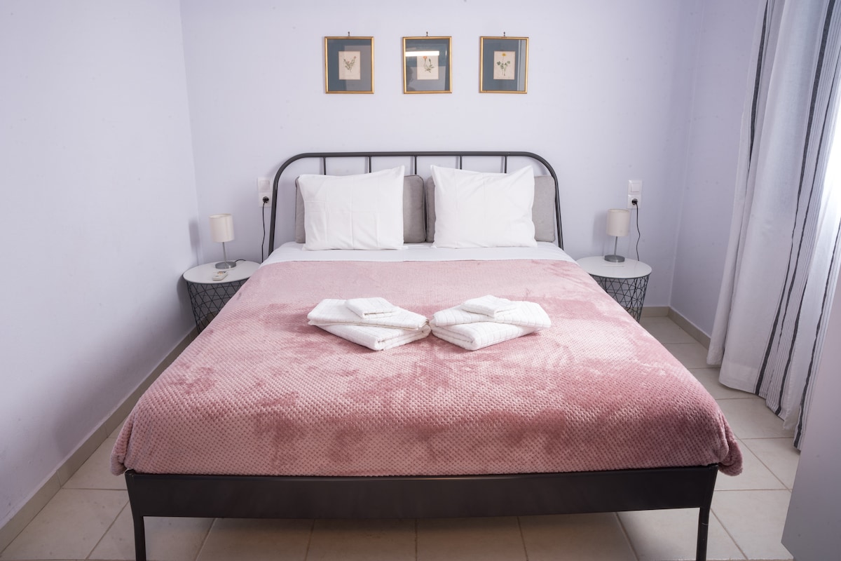 A fully-equipped villa with an attic. With its wide veranda [40m²] and the irresistible combination of stone - exterior and modern - interior, it accomplishes the perfect mix & match of the local traditional architectural style with the most modern touches. It is made up of two bedrooms, the first one [14m²] being carved in the heart of a Santorinean rock, with a concrete bed, commodes and a TV set, and the second bedroom [12m²] featuring a black iron bed with commodes.