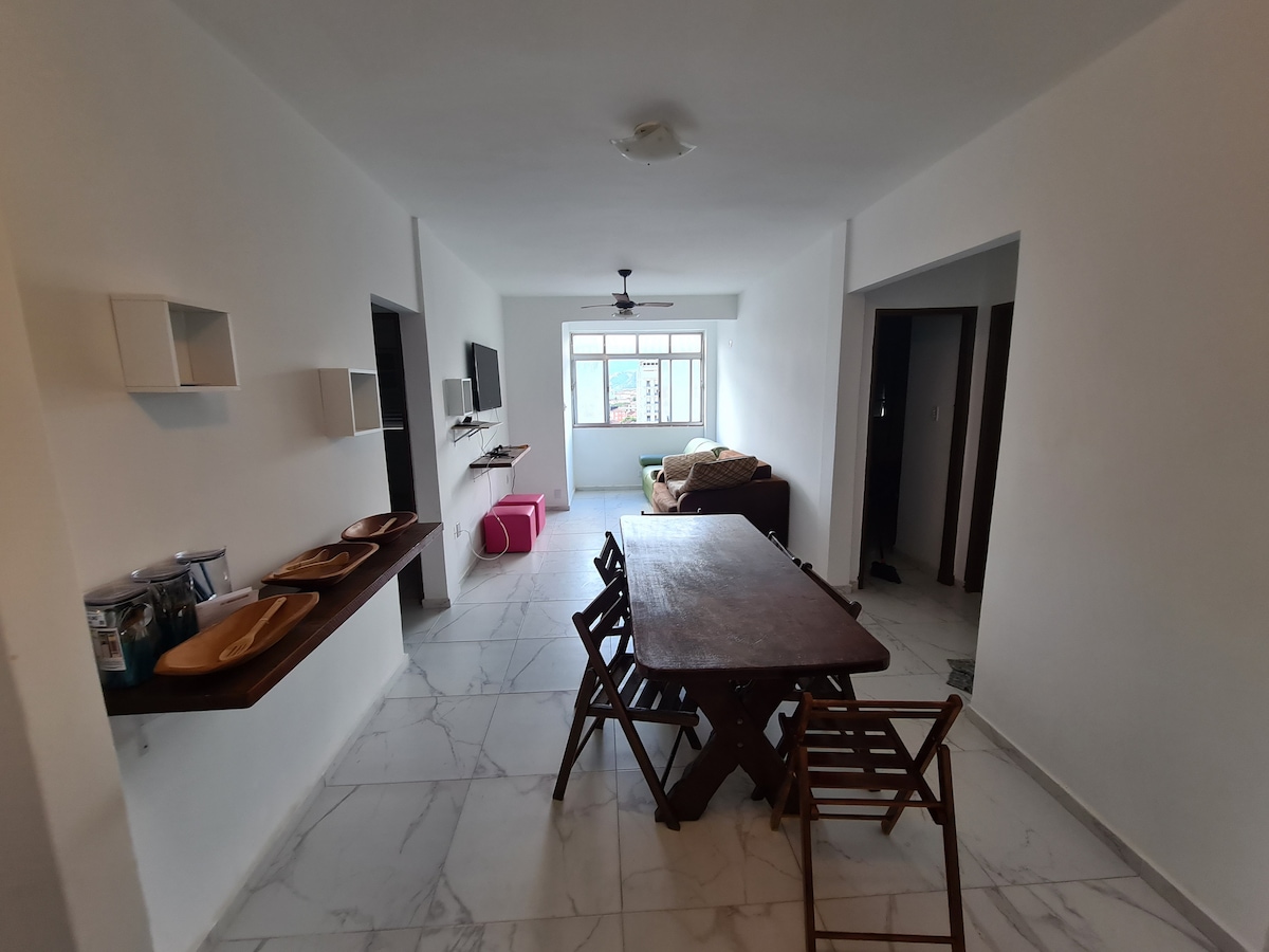 Apartamento para temporada na Enseada, Guarujá, 2 quadras da praia, próximo ao hotel Casagrande, próximo a comércios, mercados, restaurantes, bares. Apto térreo, acomoda 10 pessoas, 1 quarto com cama de casal e 1 quarto com 2 treliches, tem mais 2 colchões de solteiro para colocar na sala, sala com TV, 2 banheiros, cozinha com geladeira, fogão, microondas, liquidificador e todos utensílios. Ar condicionado nos quartos e ventilador na sala, quintal privativo com churrasqueira. Wi-Fi.