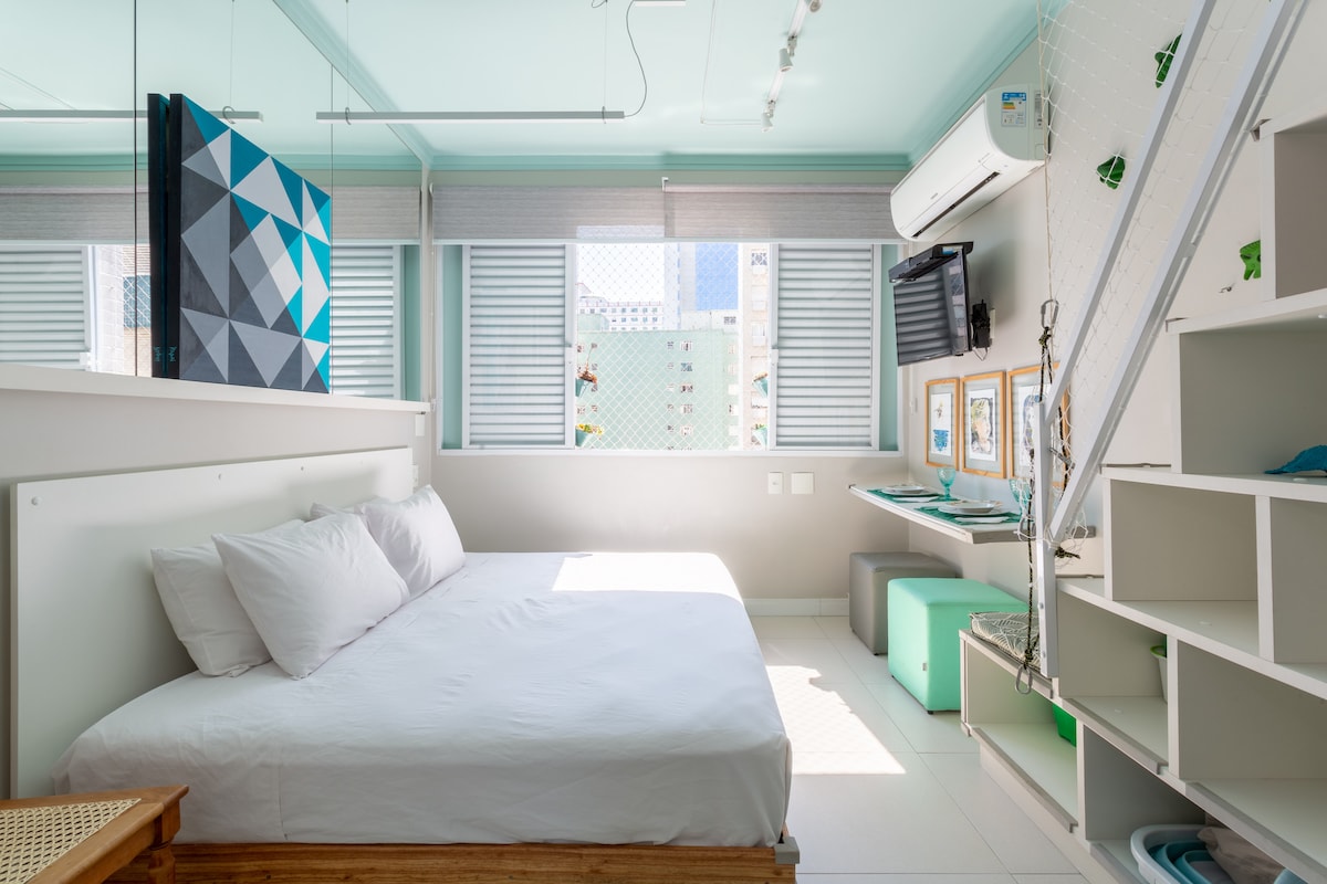 BEACHFRONT Studio in José Menino, Santos, SP. SIDE SEA VIEW. HANGING BED. CLIMBING WALL. Comfortably accommodates 2 adults (queen-size bed) and 2 children (double-size bed). :. 350-megabyte Wi-Fi :. Hot/cold air conditioning :. 32-inch Smart TV :. Electronic lock :. Kitchen (filter, refrigerator, cooktop, microwave, Nespresso machine, mixer, and pots) :. Washer/dryer :. Window screen :. Outlet protectors :. 220V voltage :. Rotating parking space, subject to availability.