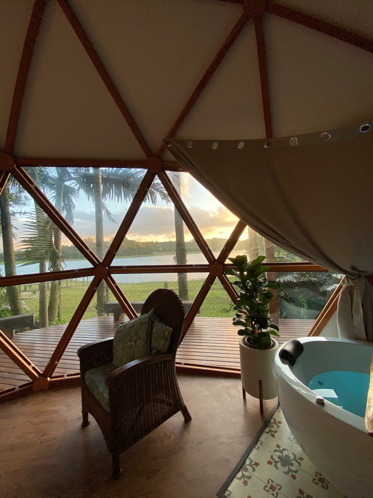 Experiência incrível em um DOMO! Perfeita para viagens a dois e para comemorar datas especiais. Mimos de Boas Vindas! Cama de casal queen com roupas de cama diferenciadas. Seu espaço interno é amplo!! Com uma banheira de hidromassagem, cromoterapia, sais e espuma de banho. Banheiro completo. Ar condicionado. Smart TV com Netflix. Cozinha equipada! Espaço externo/deck todo voltado pra Represa. Perfeito para quem busca tranquilidade junto a Natureza! Fogo de Chão! Café da Manhã - a combinar!