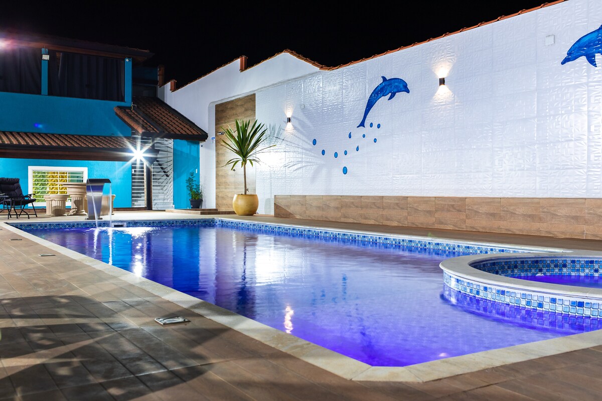Chamamos a nossa casa “Entre Águas e Montes: Refúgio Guarujá” pela sua localização e perfil gostoso para casais e famílias. A casa esta localizada em um condomínio fechado (“Condomínio Albamar”) ha uma curta distância do campo de futebol, quadra de tênis, parque e quadra de esportes mistos. A casa foi recentemente reformada e inclui uma piscina privada, churrasqueira, A/C (sala principal), ventiladores de teto em cada quarto e uma varanda acolhedora com rede e arranjos de estar.