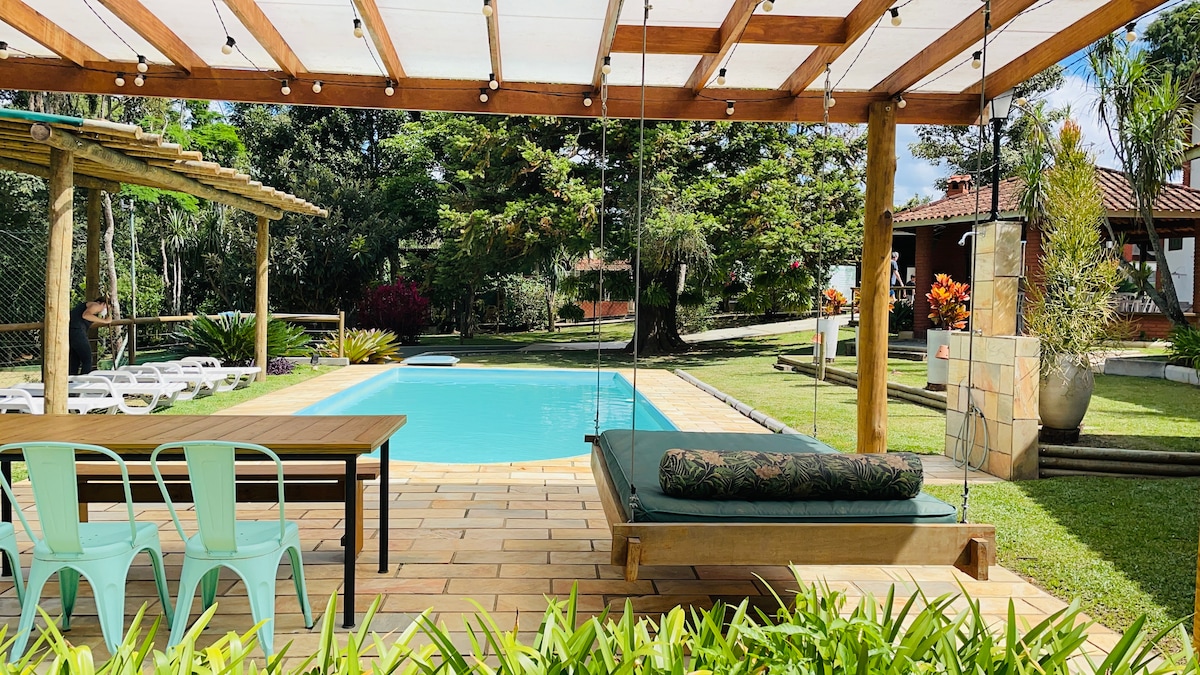 Casa de Campo (SOMENTE ATÉ 10 pessoas em todos os dias da estadia, Não é casa de festas e eventos)confortável área gourmet, lareira, mesa 10 pessoas, churrasqueira, TV aberta, piscina aquecida com trocador de calor NÃO elétrico(precisa dias de sol para aquecer), sinuca, fogo de chão, balanço, redário, da para fazer uma caminhada pelo espaço em 3000m muito verde e florido, hortinha,, encante com suas fotos, aqui você pode vir só com as amigas, total segurança e apoio moramos na propriedade.