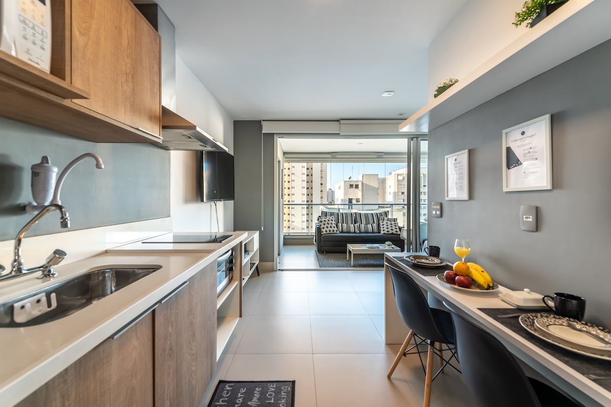 Located in the cultural center of the city, with museums, cinemas and shops, this brand-new studio is just two blocks away from Rua Augusta, and a few minutes from Av. Paulista, the best nightlife and gastronomic region of São Paulo. Fast and reliable 250mb WiFi. Easy access, 5 min. walk from Paulista, Consolação and Higienópolis/Mackenzie subway stations. The building has a complete 24-hour gym and laundry facilities and parking for 1 car.