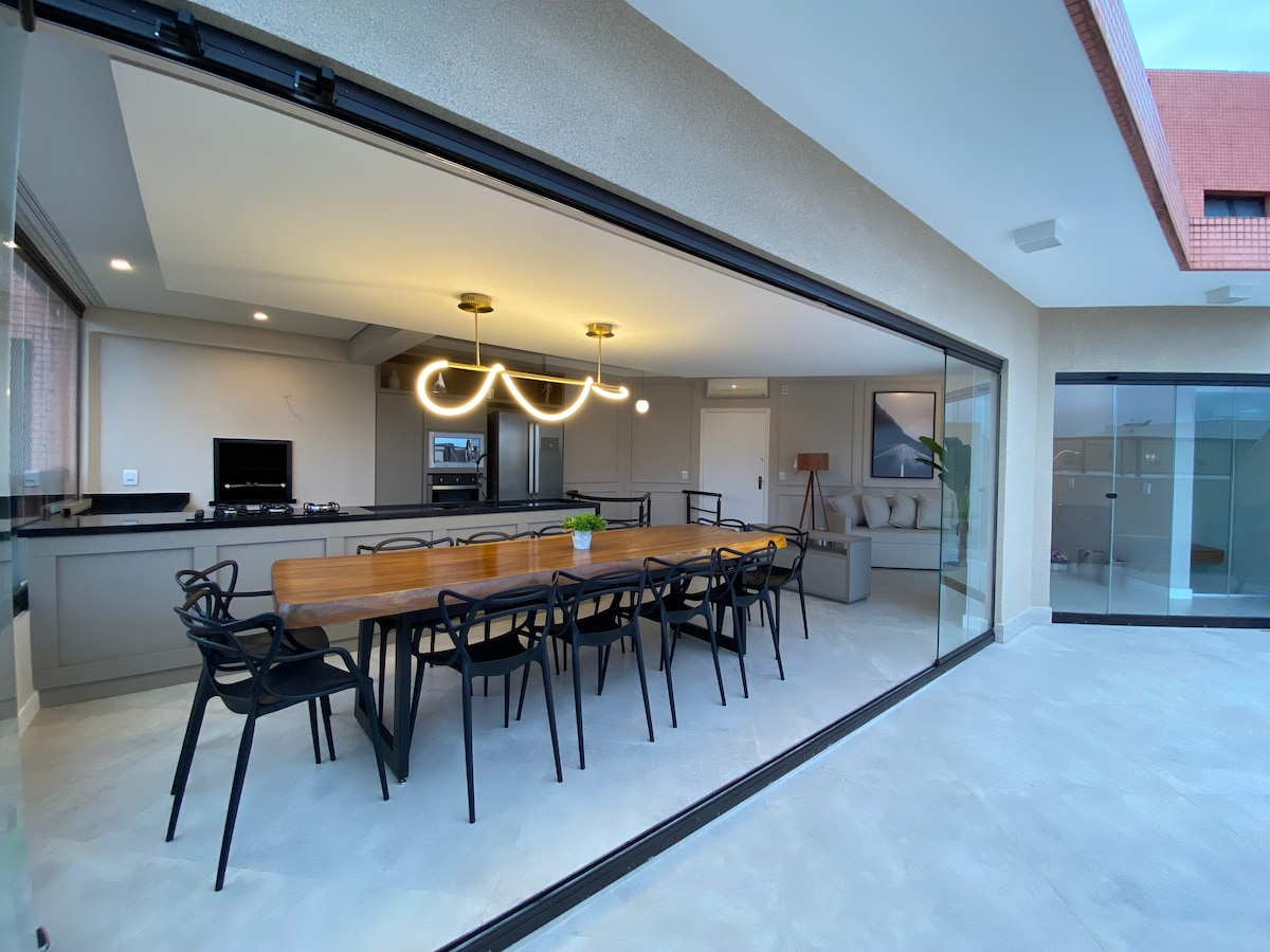 Apartamento 263 m2 de frente ao mar, com fantástica vista para toda a praia de São Lourenço e da Riviera. Grande varanda fechada com vidros circundando todo apartamento. Com 4 quartos, sendo 2 suítes, todos com armários embutidos. Ar condicionado em todos os cômodos. Televisão e acesso a internet de 120 mega. Excelente sala de jantar e cozinha conjugados com mesa p/+de 10 pessoas. Churrasqueira e mesa na varanda. Condomínio com grande conjunto de piscinas, academia e sauna. 3 vagas de garagem.