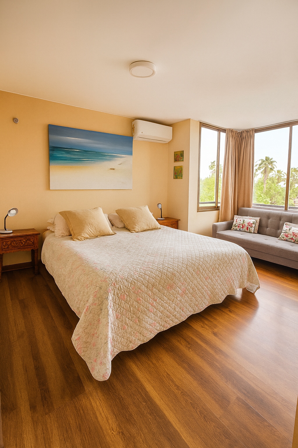 ✔ Hermoso y amplio departamento hasta 7 personas ✔ 4 dormitorios y 3 baños · Living con A/C frío-calor ✔ Totalmente equipado · Cocina completa y WiFi ✔ Estacionamiento interior privado ✔ Check-in digital fácil y seguro ✔ Barrio seguro · Frente a paradero, mini market y farmacia ✔ Ubicación privilegiada: a 2 cuadras de Mall Sport y camino a Farellones ✔ Cercano a clínicas (Meds, Alemana, San Carlos), universidades y comunidad judía (San José de la Sierra) ✔ Terraza luminosa y hermosas vistas