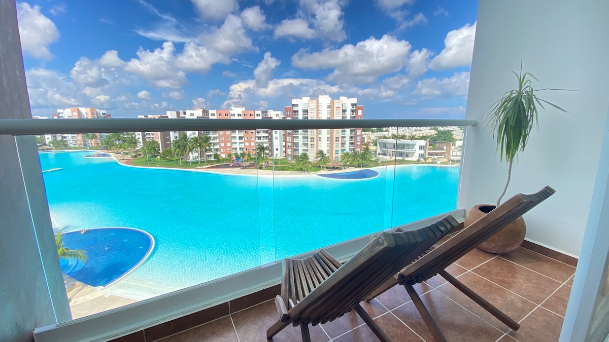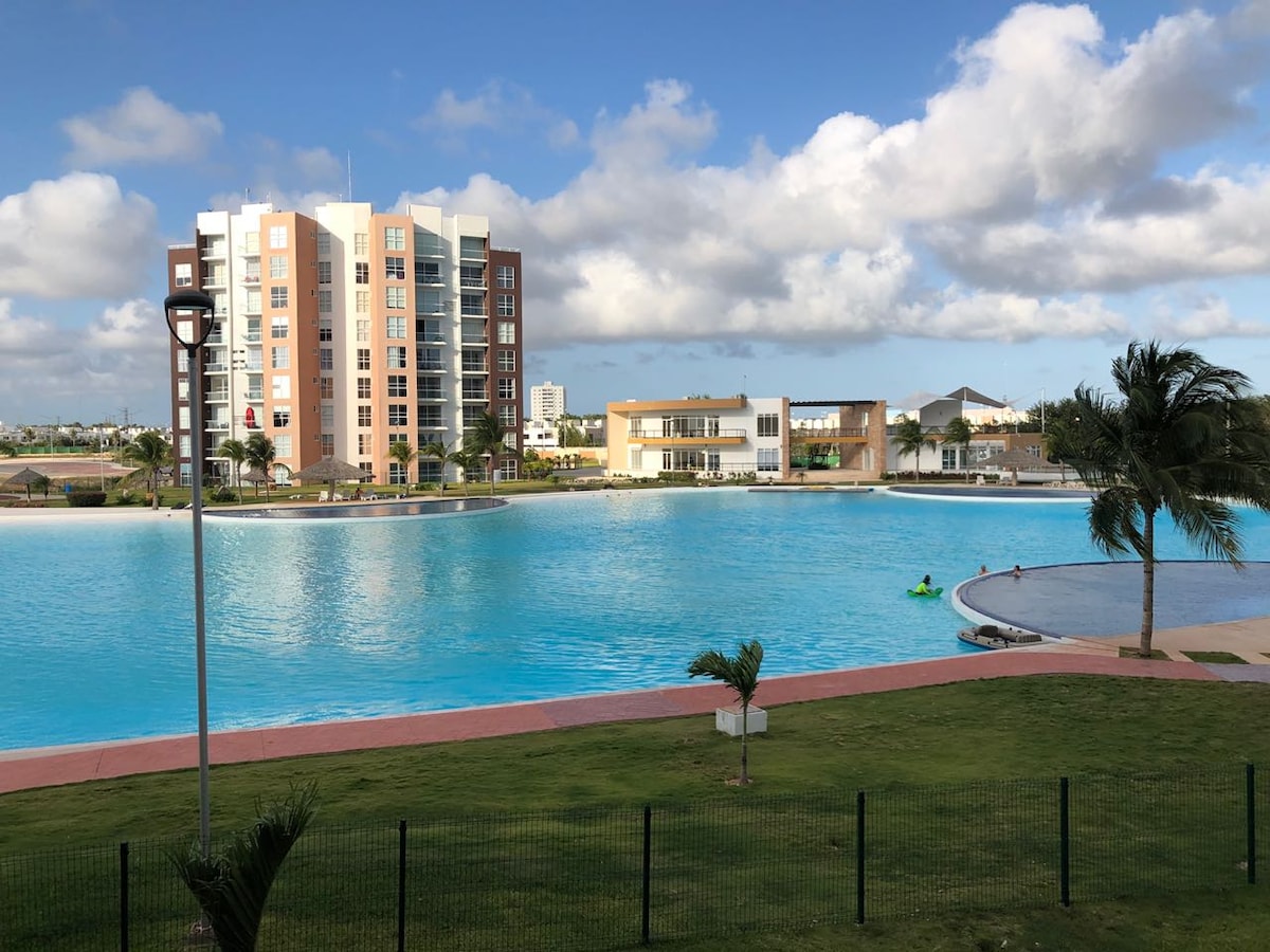 Live an incredible vacation in a beautiful apartment in "Dream Lagoon Cancun" With a lavish artificial lagoon of 1km in diameter, where you can enjoy the Caribbean sun while enjoying the beautiful sunsets. You can kayak, sail or simply relax on a lounge chair. Integrated into the lagoon there are seven pools, and around a track for running in the mornings. ➼ South of Cancun in a quiet area with 24/7 security. ➼ Airport 25 min ➼ Beaches 25 min