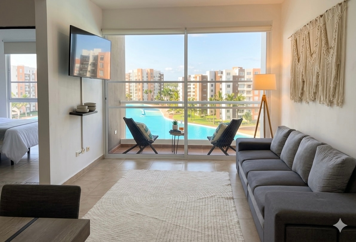 Enjoy this cozy apartment ideal to rest and have fun on your vacation. Relax from each of the bedrooms, living room or terrace while contemplating the beautiful view of the lagoon. Swim in one of the 7 pools around the lagoon or go kayaking. Sunbathe in one of the lounge chairs or jog on the track. TI will be happy to share with you trusted contacts for car rental, transportation and tours at preferential prices. 24/7 security