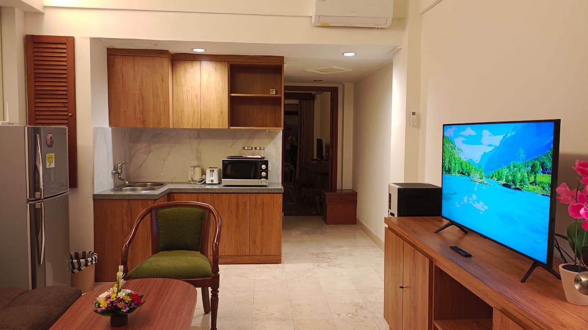 ★Very Spacious Room 42㎡ And Spacious kitchen and lounge area, 1 Bedroom Green Studio Apartment is tastefully decorated, This apartment have Six-studio Apartment complex with third floor level, with the total building size of 265 ㎡, with every room size 42㎡. Every Studio Apartment features a spacious One Bedroom (King Size Bed200 X 200 cm),kitchen set, AC, Free WIFi,Washing Machine,TV LCD LED 43 inch,DVD Player with HDMI,huge shared swimming pool,Long stay would be more than welcomed! 日本語も対応出来ます!