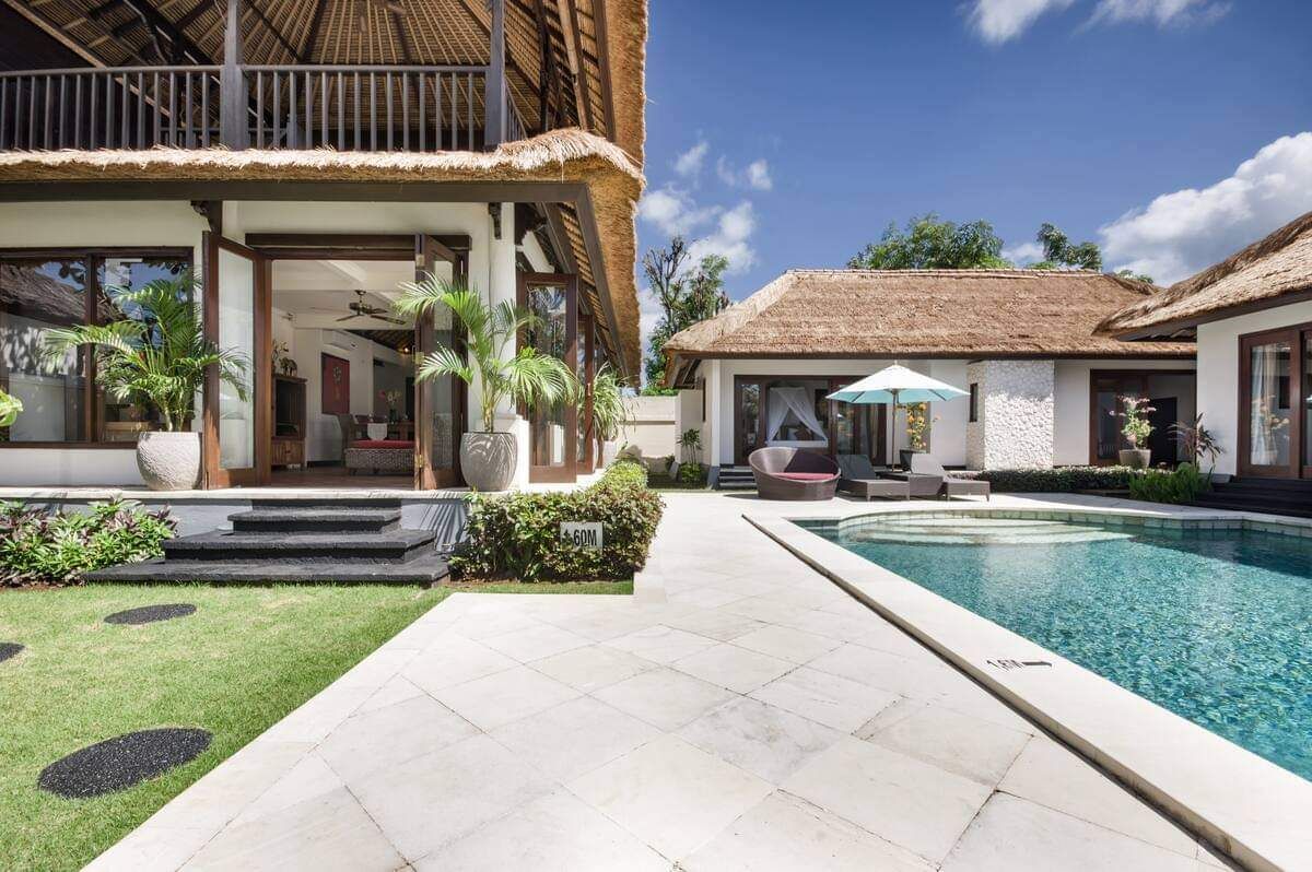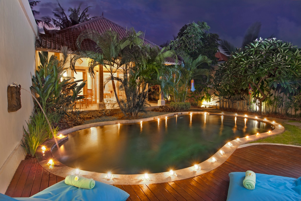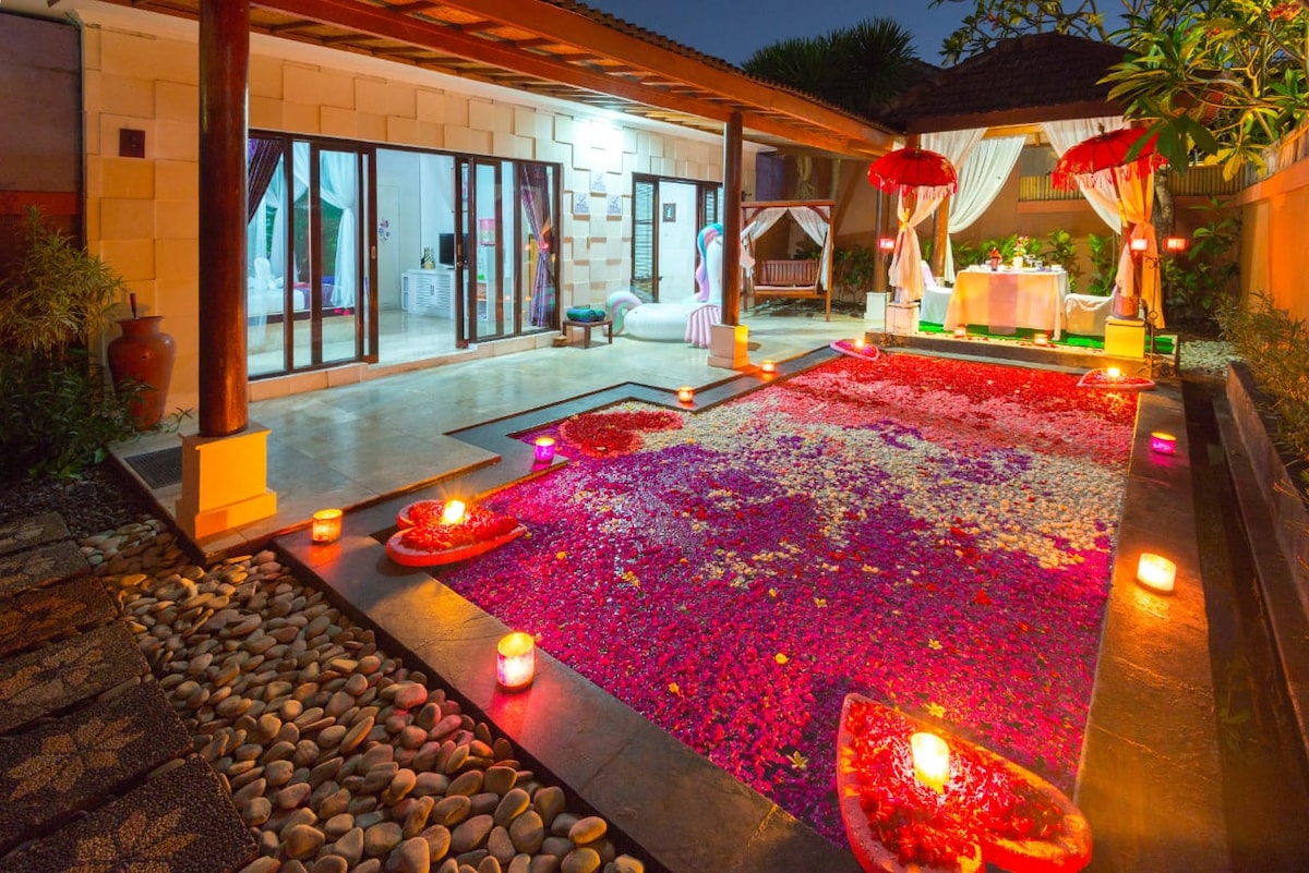 The two bedroom deluxe villa situates in simply the best area of Seminyak, but perfectly hidden in a serene and quiet villa neighbourhood, featuring: 1. private posh pool bar with a swinging love seat 2. sunken seating area in a tropical setting 3. lavish garden by pool 4. a terrace at second floor - enough space chill and soak up the Bali sunshine! Enjoy your romantic private times close to a fine selection of world-class cafes, restaurants and beach clubs.