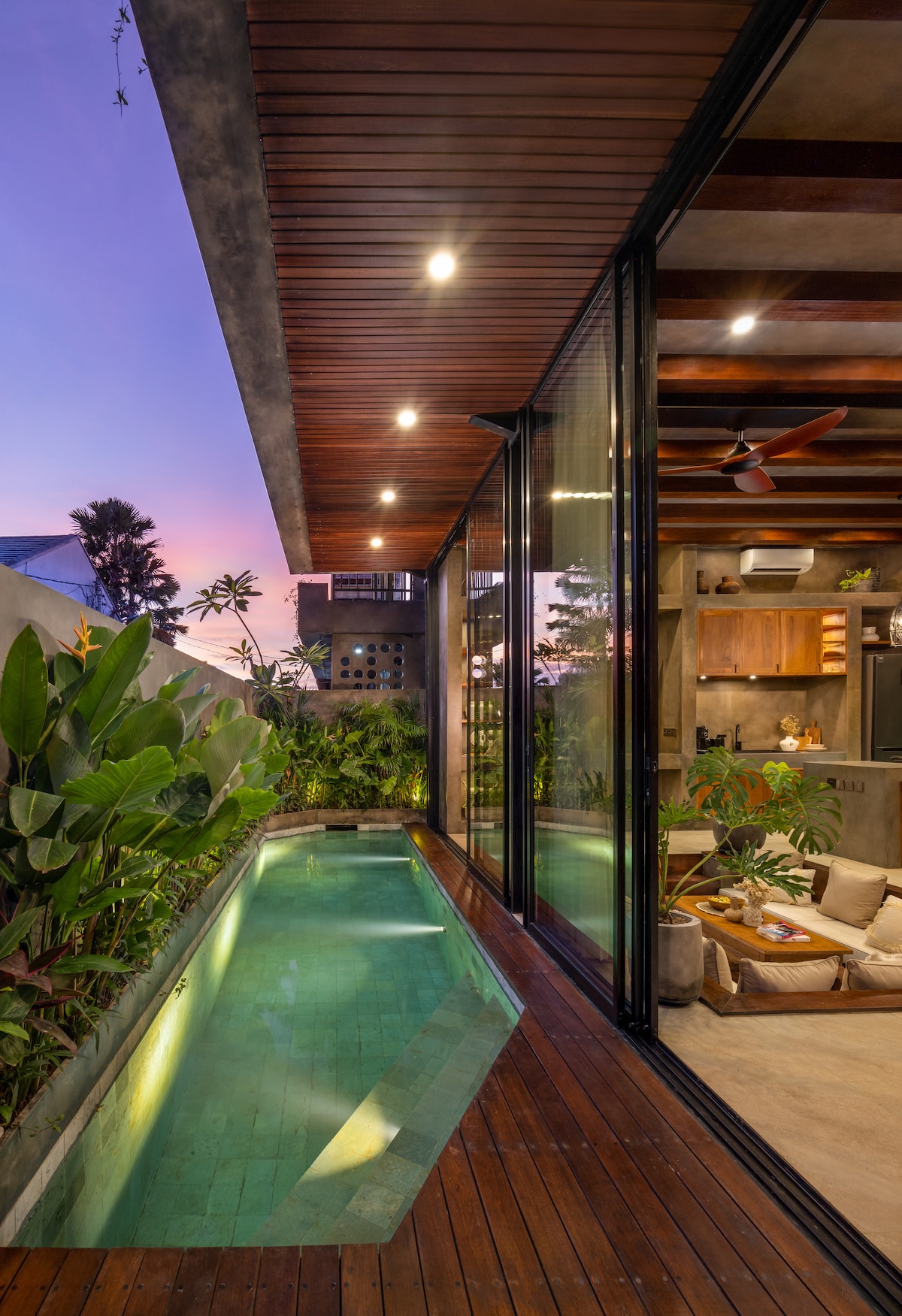Warm wood. An open courtyard. A two-bedroom villa shaped around a central pool, where every space turns inward and distractions stay outside. Mornings feel unhurried, afternoons stay shaded, and evenings settle naturally as the light softens across the courtyard. Located in Kerobokan between Seminyak and Canggu, cafés and beaches are around 10–15 minutes away by scooter. And once you are back, everything stays quietly centered.