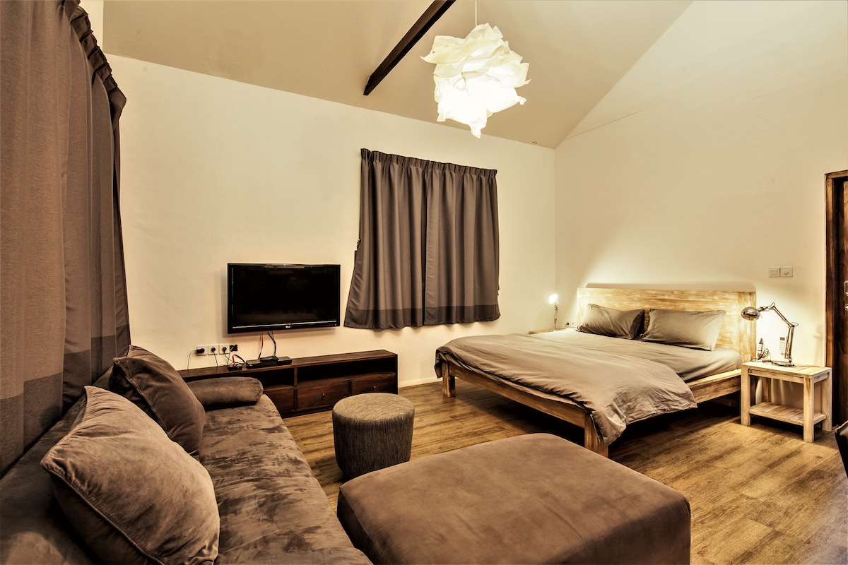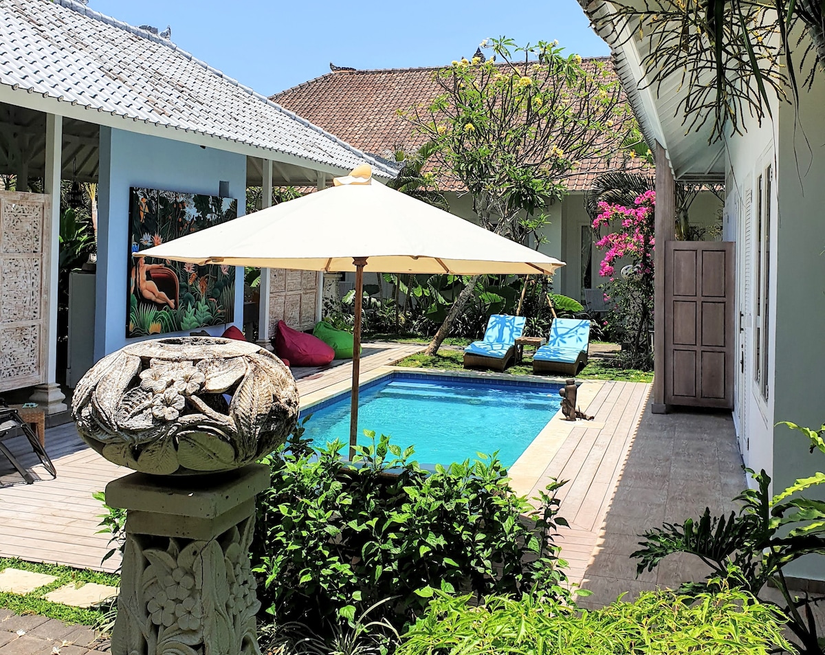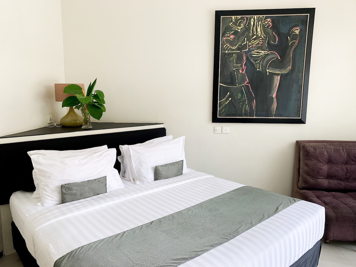 This stylish place to stay is perfect for group trips. It is one of fifteen apartment/studios in a beautiful family run boutiqe inn. The Studio is a self sufficient unit in a secure upscale neighbourhood. It consists of large bedroom and living area that gives you the extra space for sleep and relaxing, kitchen/dining area and the pool in a shared courtyard garden. This studio has a fresh interior design and is located in the centre of Seminyak just steps away from the beach