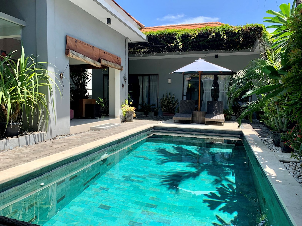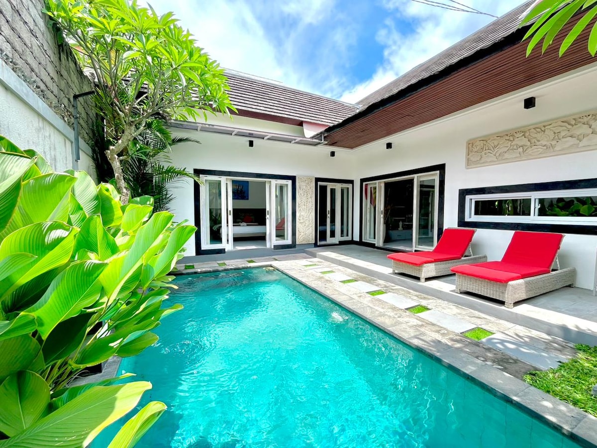 Wake up to the view of our tropical garden, as you slide open the glass doors to welcome the morning breeze. Enjoy breakfast in the open-air living area, and Lounge by the pool to soak up the sun. What to expect: 2BR with ensuite bathroom / open-air living area with equipped kitchen / Private pool with deck & sun lounges / High speed optic fiber Wifi / Cleaning 6 day per week / located in quiet residential neighbourhood in Seminyak / Concierge services, support & assistance 24-7 and more.
