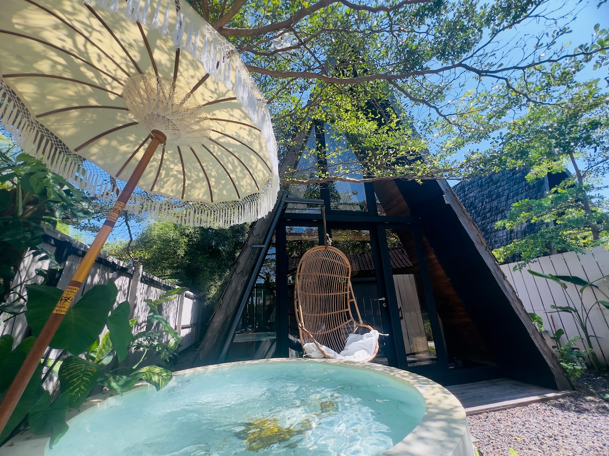 Escape to our charming wooden mezzanine cabin, a perfect hideaway nestled in nature. Designed with rustic warmth and modern comforts, this unique retreat features natural wood interiors, an open-concept loft-style bedroom, and a private outdoor plunge pool where you can unwind under the stars. Whether you’re looking for a romantic getaway or a peaceful solo retreat. Wake up to the sounds of nature, sip your morning coffee on the terrace, and soak in the plunge pool after a day of exploring.