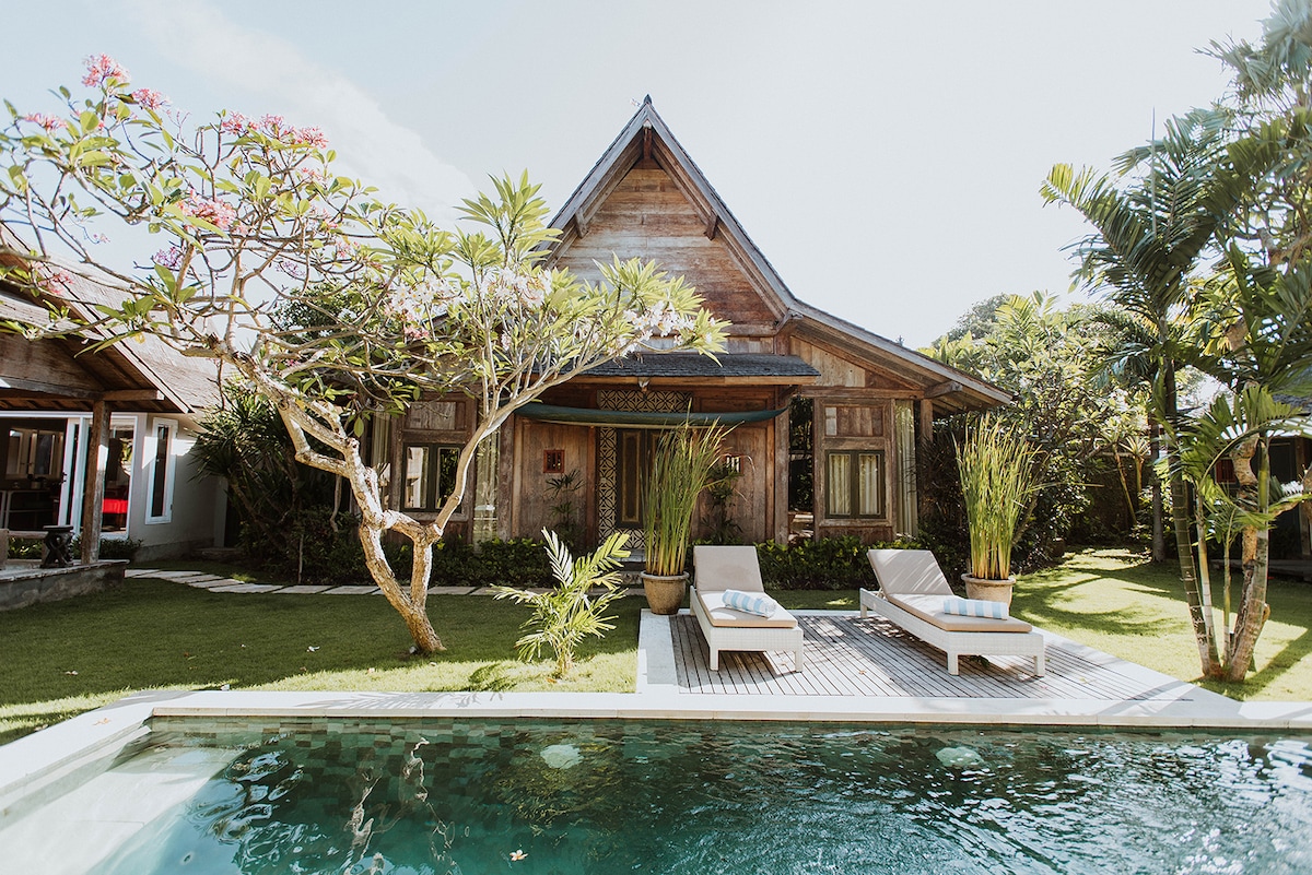 古典爪哇式别墅,带热带花园和游泳池