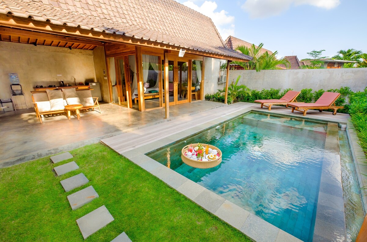 现代巴厘岛风格别墅,配备泳池和工作人员。