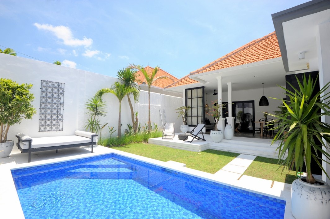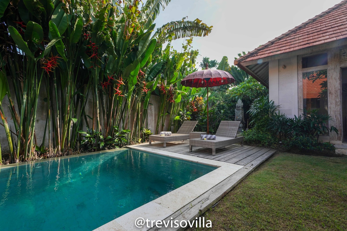 A beautiful 2 bedroom private villa with serene garden and lush swimming pool. Each bedroom has king size bed 180x200 with AC and ensuite bathroom, a bath tub provided in master bathroom. Treviso villa coming with spacious living room, dining room and complete kitchen with cooking utensil. Wifi is provided on entire villa. Cafe Del Mar, Mexicola club, Watercrest Cafe, Wild Hog, Batu Beliq beach is just on walking distance. Airport is 25min away Villa is on 400Sqm land. Small heaven in Bali