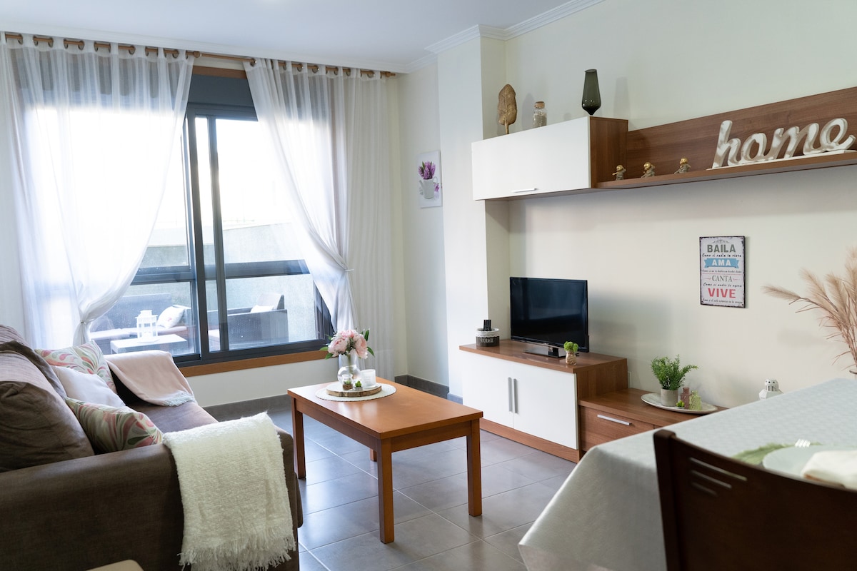 Apartamento a estrenar a 180 metros de la playa Silgar en Sanxenxo. Cocina americana, salón con sofá cama de gama alta de 1,60 (Marmota Premium), Smart TV, dormitorio principal con cama de 1,50 (Marmota Hybrid Premium), vestidor, cuarto de baño, lavandería y una gran terraza con comedor. Incluye: toallas, sábanas, menaje de cocina, tabla de planchar, plancha, tostador, exprimidor, cafetera y todo lo necesario para el alojamiento de un bebé. Piscina, parking, ascensor, wifi y suelo radiante.