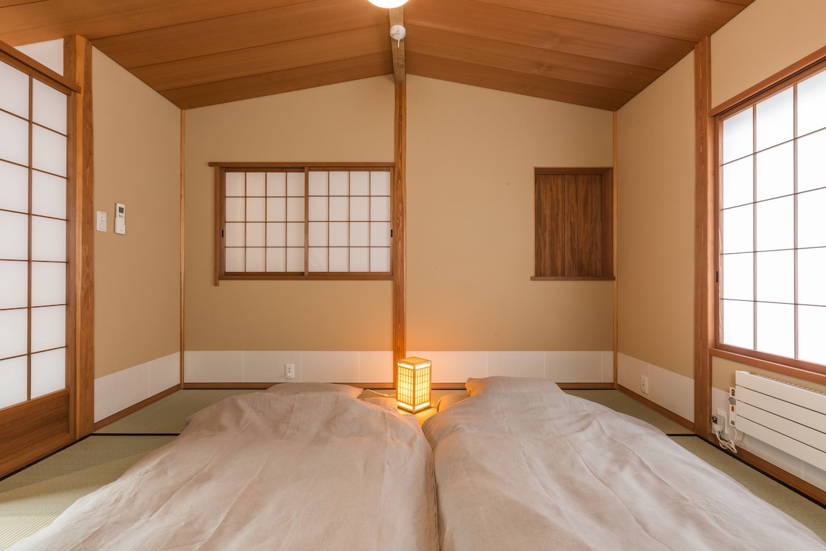 NEW・新开张民宿 步行约8分钟即可到达世界遗产“二条城” 从京都站搭乘计程车约 12 分钟 从 JR 二条站、地铁二条站步行约 6 分钟。 步行2分钟至巴士站 「三条、四条河原町地区」 岚山/金阁寺/北野天满宫」 「清水寺、祗园、八坂神社、冈崎运河、平安神宫」 搭乘电车或巴士可轻松前往京都代表性的旅游景点。 附近有大型超市、餐厅、便利商店,地理位置十分便利。 ★关西机场出发【无月邸】 ① 搭乘机场巴士约1小时30分钟 > 京都站 ② JR - 搭乘HARUKA 1小时25分钟 > 京都站 ③ 从京都站搭乘JR山阴本线 > 3站7分钟,在二条站下车 > 步行约6分钟 包括床在内均由职人纯手工制作, 为了提供奢华的住宿体验,我们出租整栋建筑,每天只接待一组客人,并配有半露天浴池。 所有客房均配有空调、设备齐全的厨房、地暖、滚筒洗衣机/烘干机和免费无线网路。 基本的调味料、炊具、餐具、米、电锅等也是免费提供。
