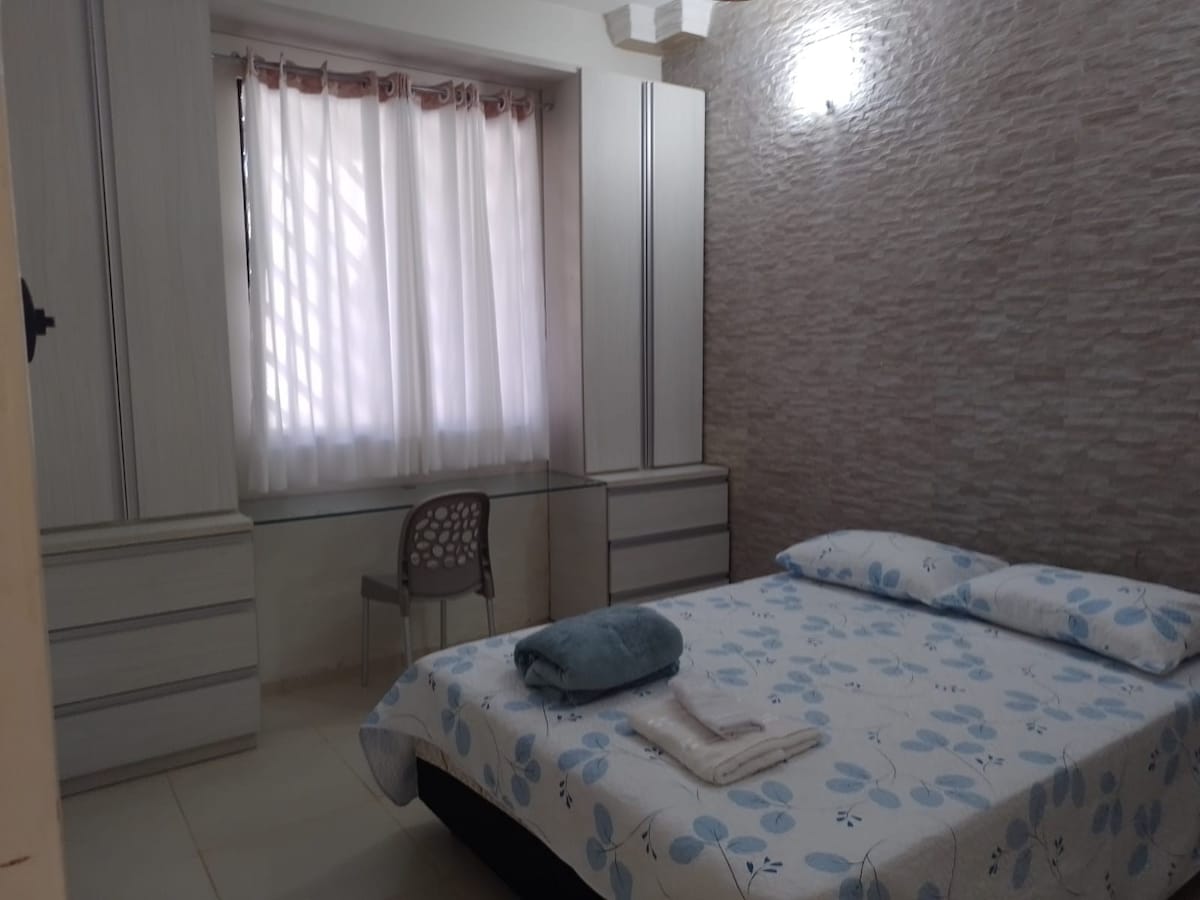 Relaxe com toda a família nesta acomodação tranquila e de boa localização, Garagem coberta para seu carro…São 2 quartos. 2 camas de casal e 1 de solteiro e 3 redes. Disponibilidade para 6 redes. 2 banheiros. 2 ventiladores. roupas de cama, travesseiros, toalhas. Obs: locação de 1 diária não disponibilizamos enxoval(cama/banho).